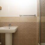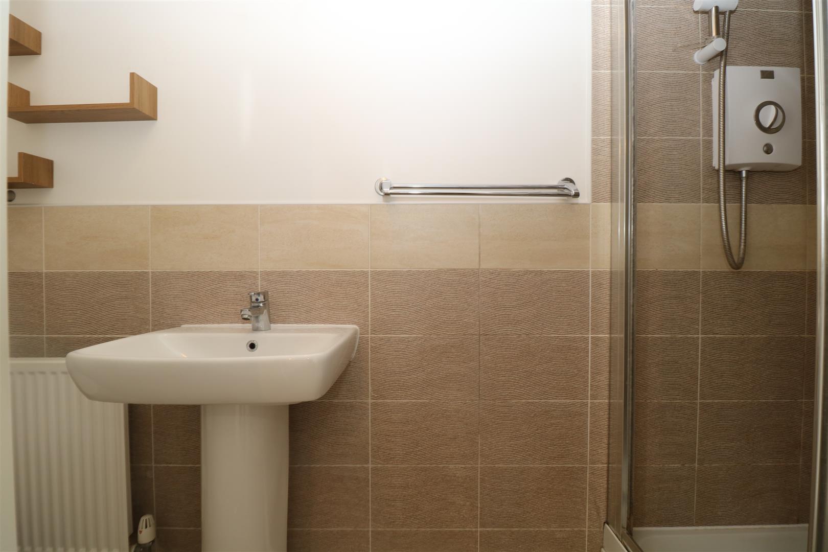 Enclosed fully tiled shower cubicle with shower, hand wash basin, low level W/C, extractor fan, Vinyl flooring and a radiator.
