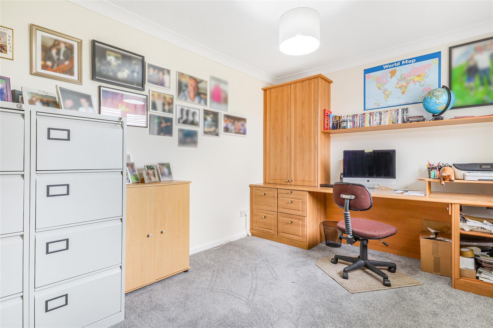 Window to the fore with a radiator beneath. Fitted office furniture that includes a desk , drawers and cabinets.