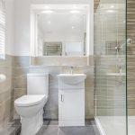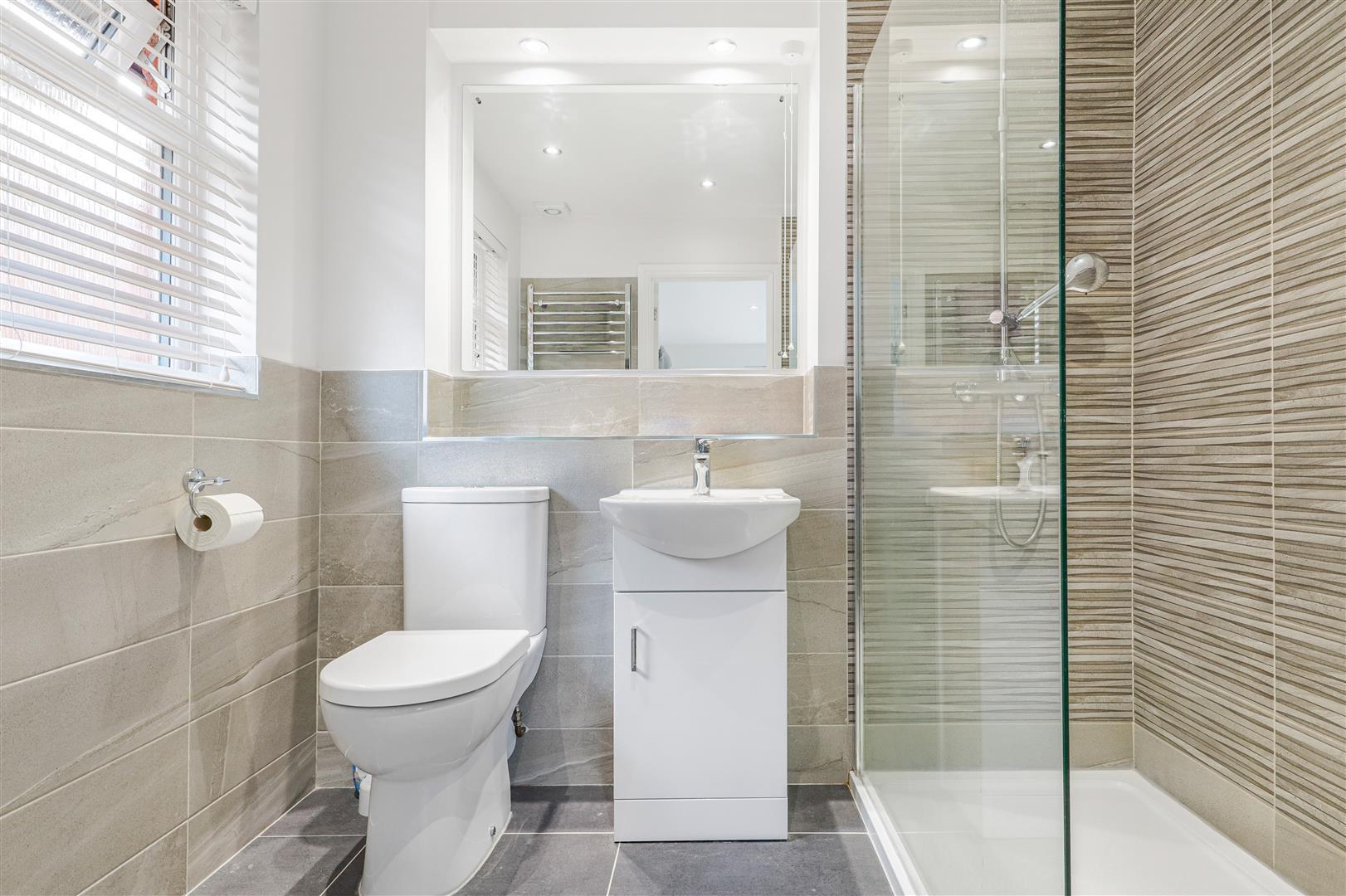 With a walk in shower with rainfall shower. Vanity wash hand basin and a close coupled wc. Tiled splashbacks and floor. Recessed mirror, chrome heated rail and a frosted window.