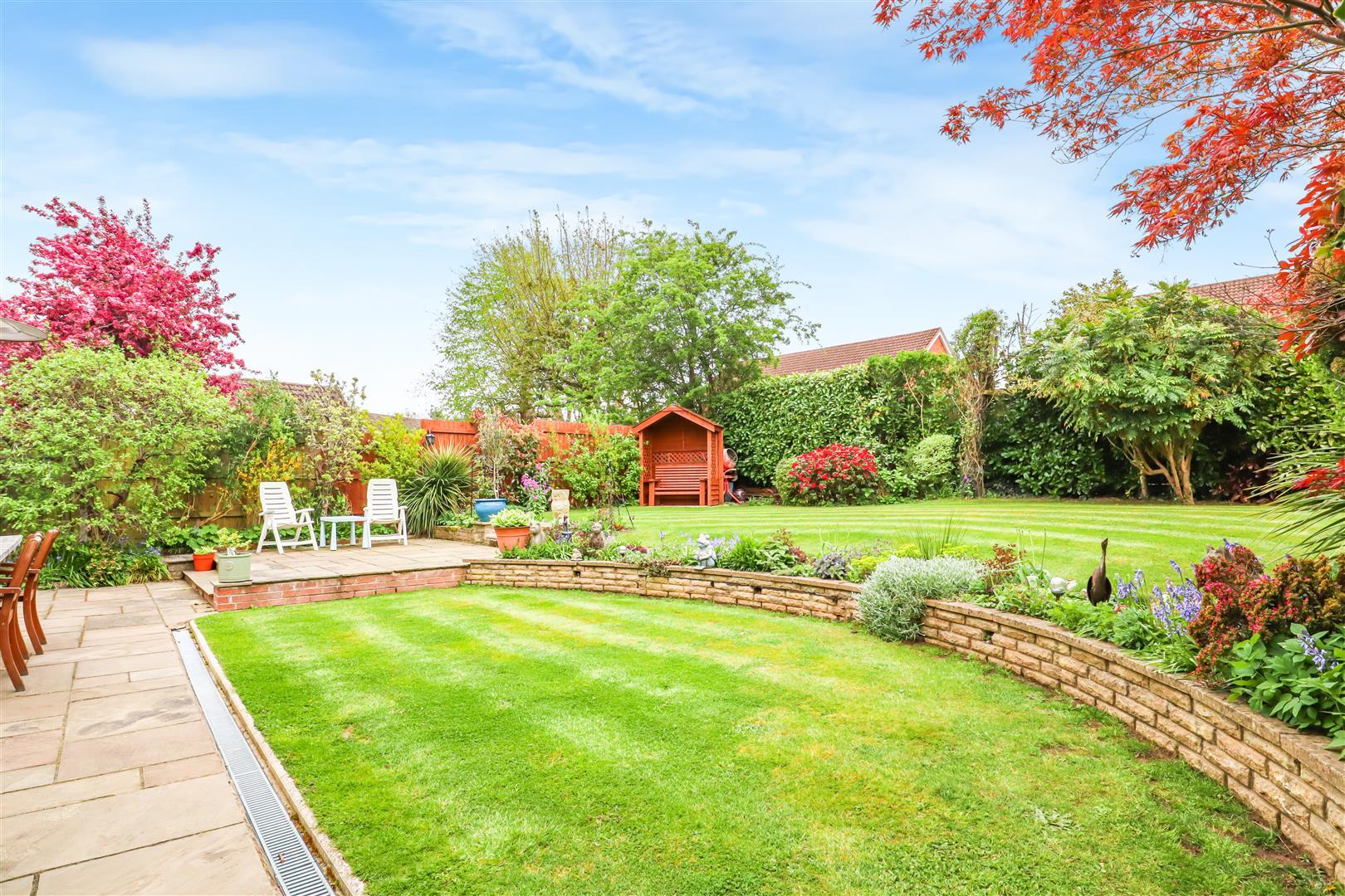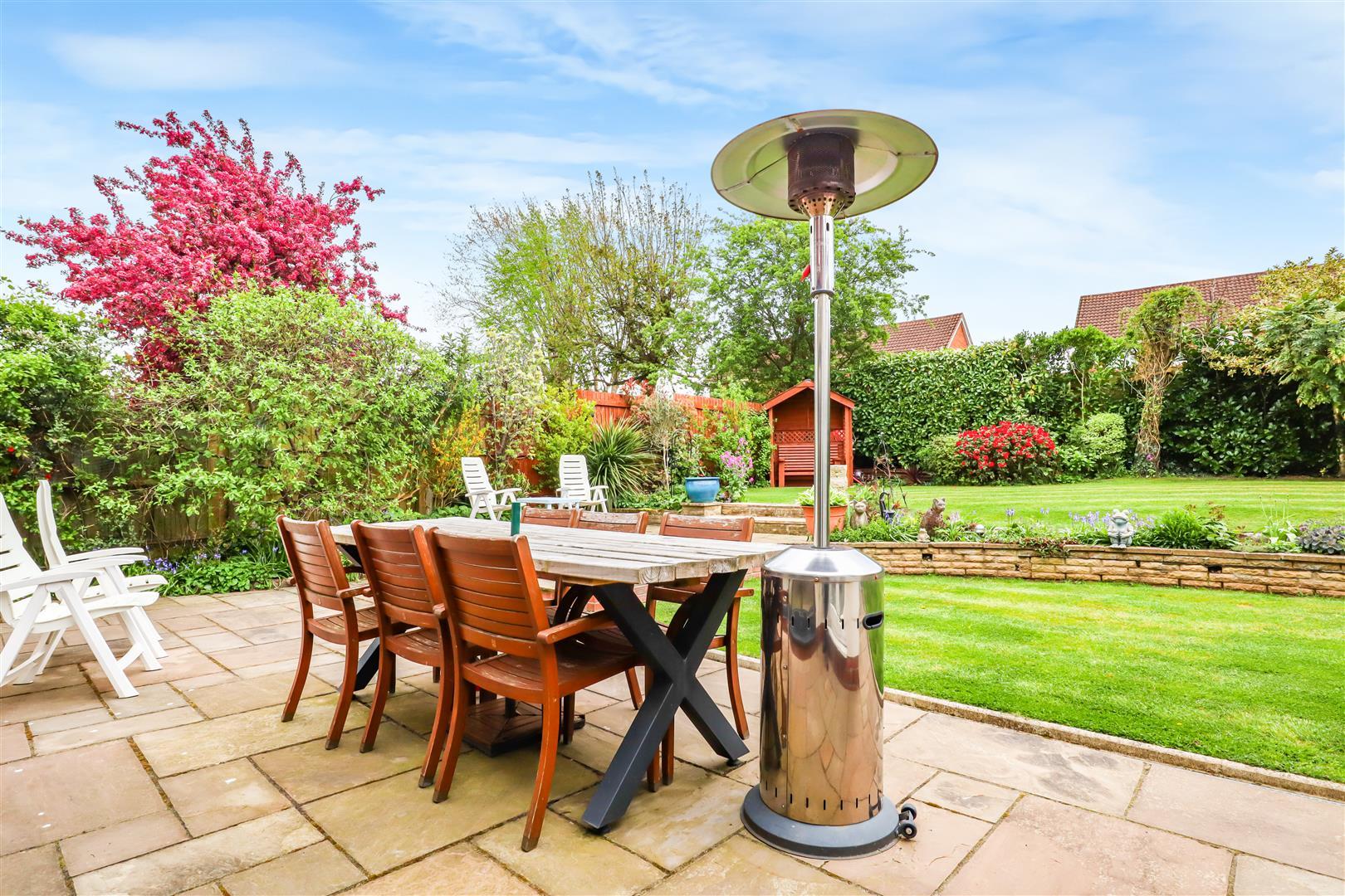 With block paved pathway to the side that leads to the rear patio and raised terrace. Two formal lawns that have mature shrub borders. Outside tap, power and side pedestrian access.