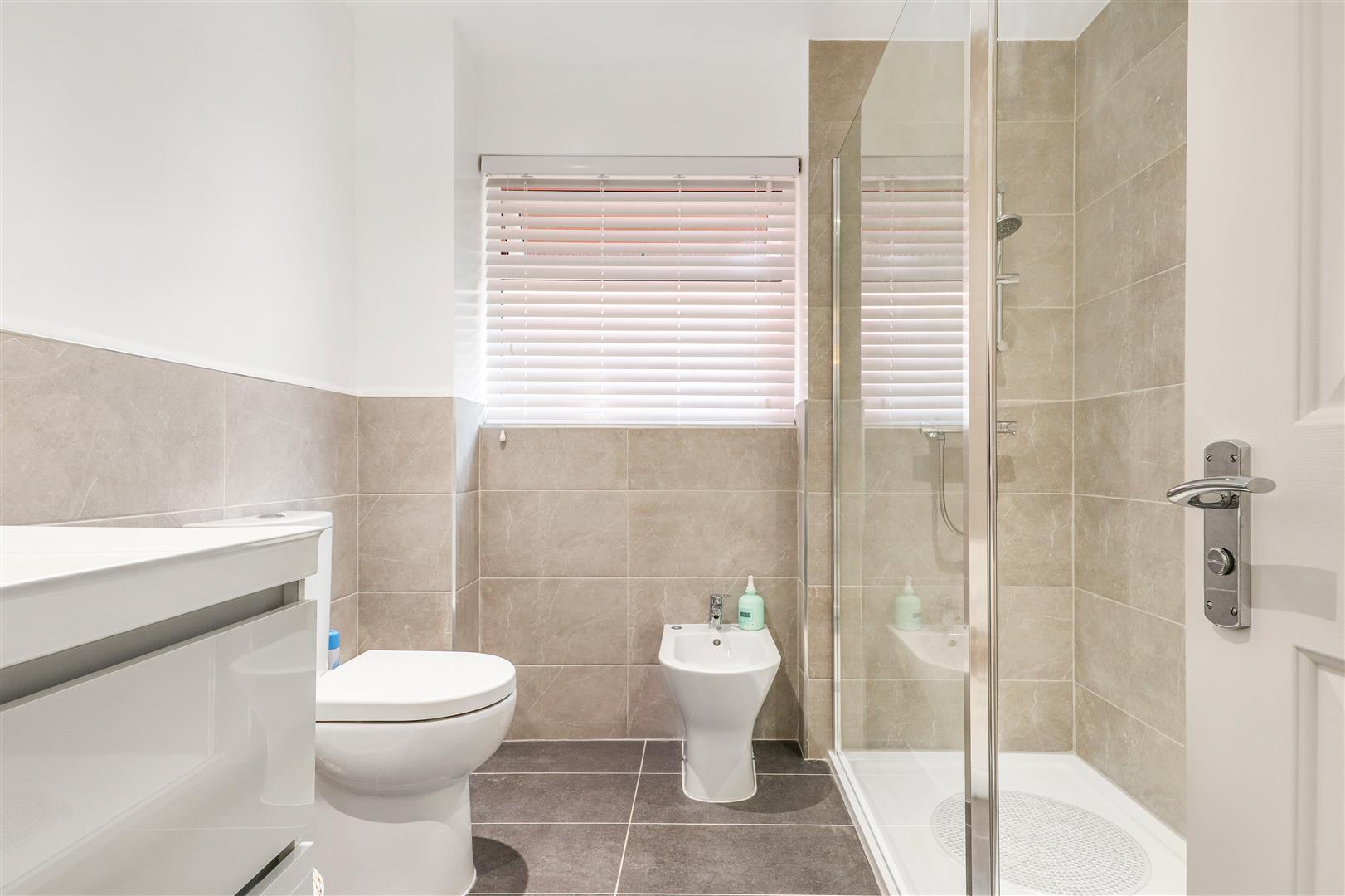 Fitted with a walk-in shower featuring a thermostatic shower unit, a close-coupled WC, bidet, and a vanity wash hand basin. The room is finished with a tiled floor and complementary splashbacks, along with a frosted window providing natural light and privacy, and a chrome heated towel rail.