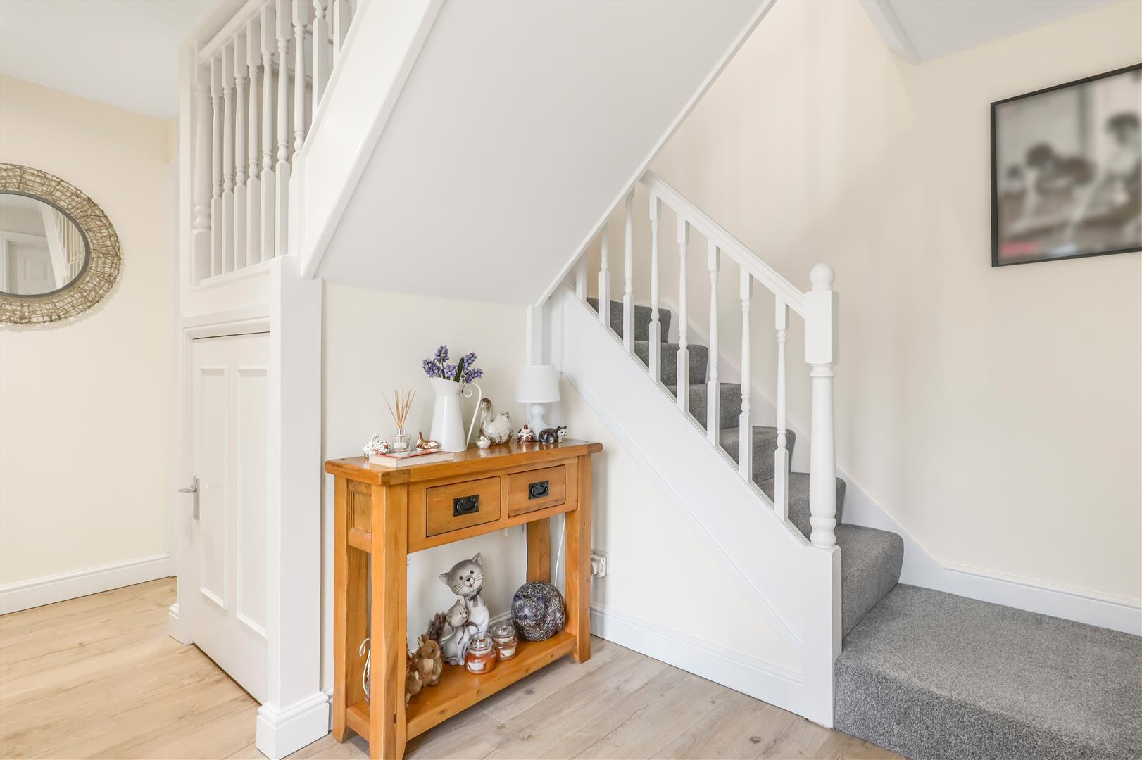Entered through a composite door with frosted side light window. Dogleg stairs to the first floor with understairs cupboard. Double radiator and doors off to: