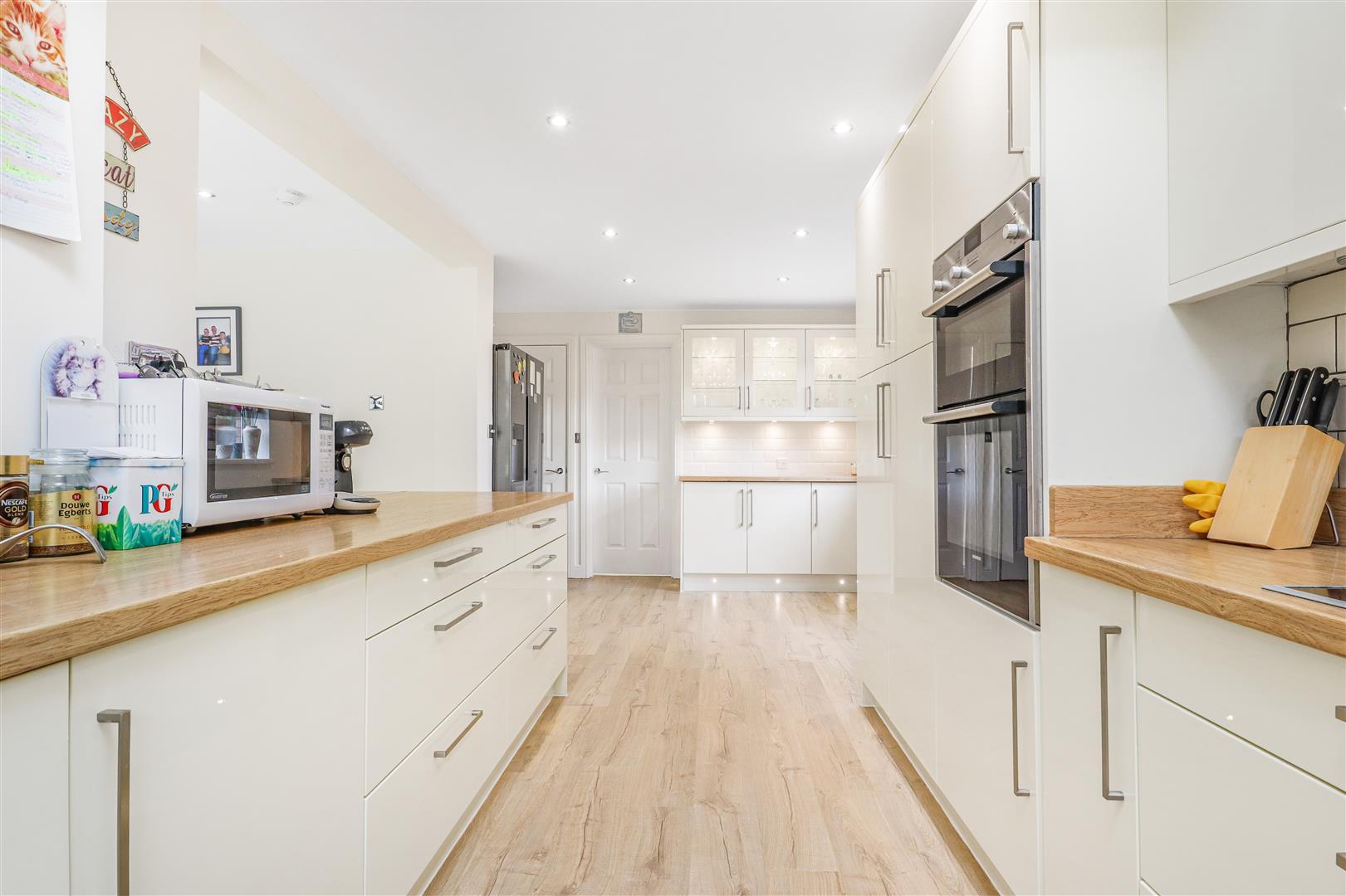 The kitchen is stylishly appointed with a comprehensive range of cream high-gloss wall and base units, complemented by wood-effect work surfaces. An inset stainless steel sink with mixer tap sits beneath the worktop, alongside a halogen hob. There is an eye-level oven with grill, integrated within a bank of floor-to-ceiling units, along with a built-in dishwasher. Additional features include pan drawers, tiled splashbacks, and a striking vaulted ceiling. A window to the rear provides natural light, while a door offers access to the side of the property.