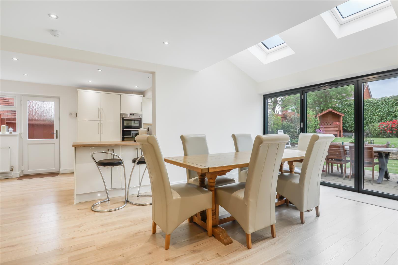 With bi folding doors onto the rear patio. Radiator and a vaulted ceiling with skylight windows. There is a peninsula separating the dining room from the kitchen.