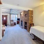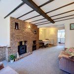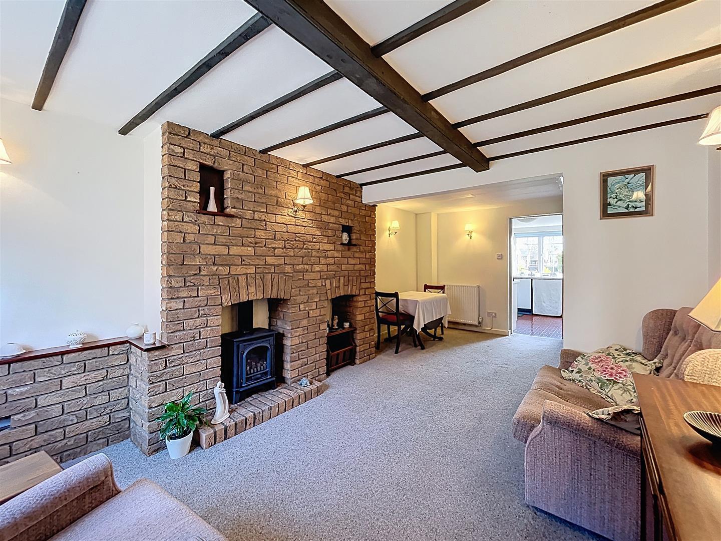 A well-proportioned living room large enough to accommodate both lounge seating and a dining area featuring a range of character elements, The main focal point is a exposed brick chimney breast with an inset living flame gas affect fireplace set on a raised hearth. There are built-in alcoves and display niches within the brickwork, providing useful shelving space. With exposed timber beams, wall lights, dual radiators and dog leg stairs rising to the first floor and covered access to cellar below.
