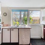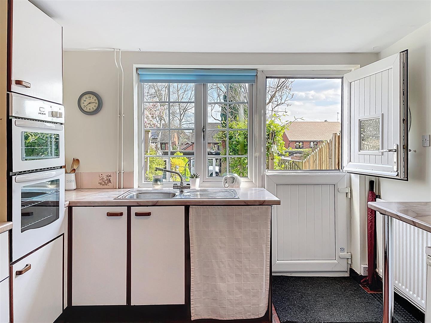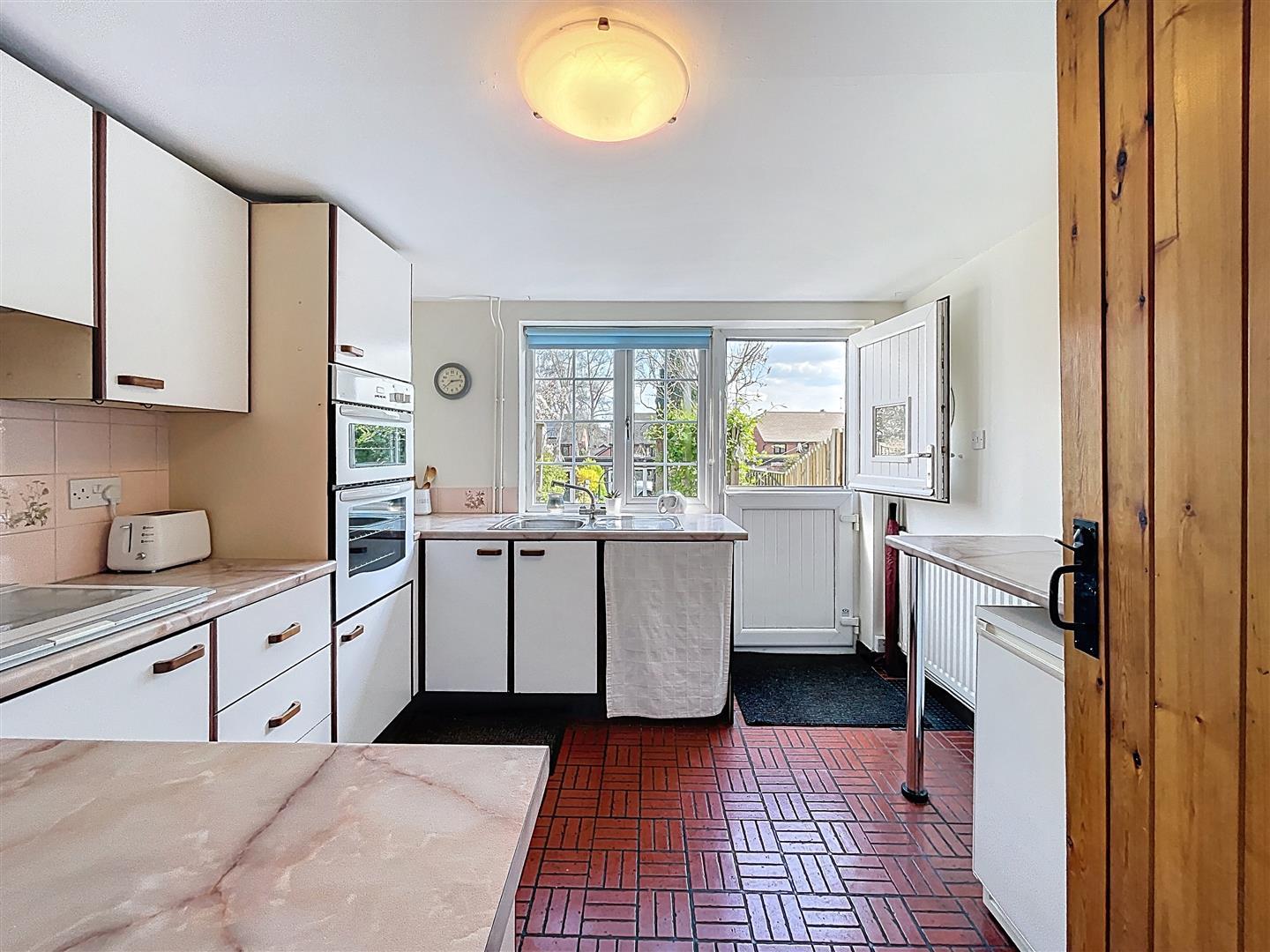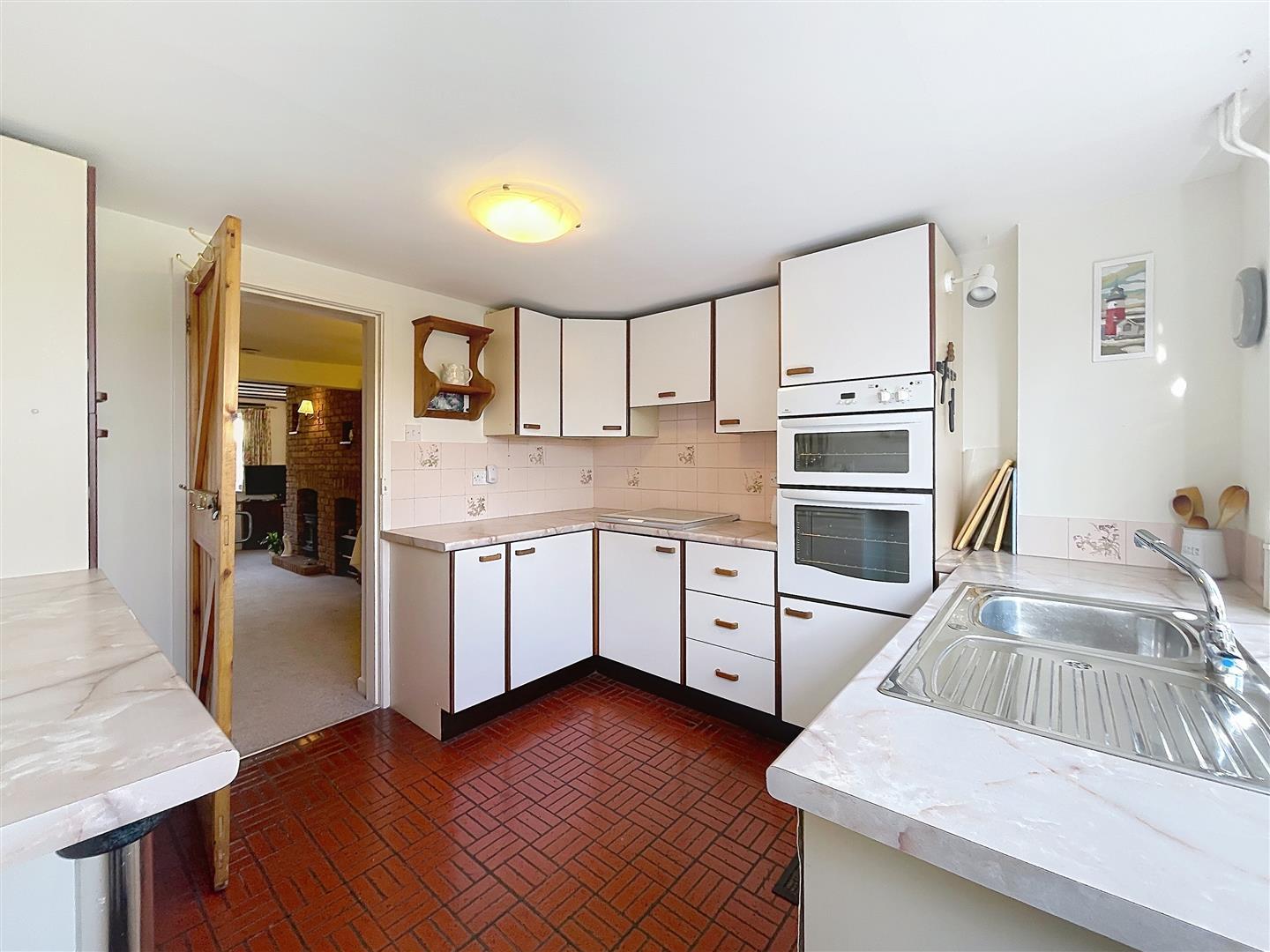 Fitted with a range of wall and base units with rollover worktop, quarry tiled floor, ceramic tile splashback, inset stainless steel sink with chrome mixer tap and drainer positioned beneath a rear-facing window, Integrated appliances include a four ring gas stove hob and built-in eye level double oven, with additional space and plumbing for washing machine/dryer and undercounter fridge/freezer. To the rear, there is a part-glazed Upvc stable door providing direct access to the garden.
