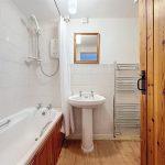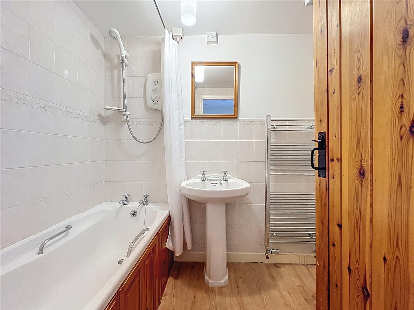Comprising a low-level WC and a pedestal wash hand basin set beneath a wall-mounted mirror. Fitted with an extractor fan, central ceiling light and heated chrome towel radiator. A panelled bath features an electric shower over, complete with a fitted shower rail and curtain, and is complemented by a full-height ceramic tiled splashback.