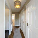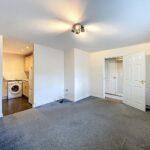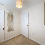 Featuring a Georgian-style door and laminate flooring, the space includes two large storage cupboards, one that houses the modern electric boiler for heating the radiators and supplying hot water, as well as the wall-mounted electric isolation unit and the other a large storage space.
