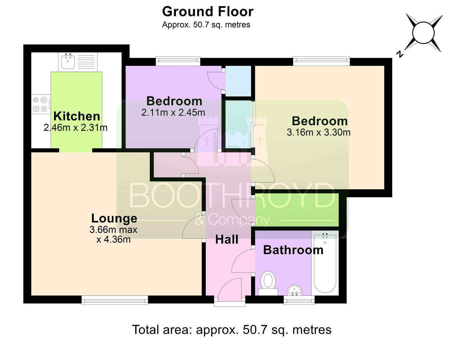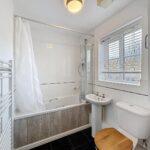 Fitted with a white suite that comprises a panelled bath with thermostatic shower over, pedestal wash hand basin and close-coupled wc. Frosted window to the fore, extractor, vinyl flooring and a heated towel rail.