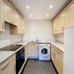Fitted with beech effect units to the wall and base. The base units are complemented by a stone effect roll-top worksurface, which includes an inset single drainer sink unit, tiling to the splashbacks, a built-in Bosch electric oven, a four-ring Bosch hob, and an extractor canopy. Included in the sale are the washing machine and an upright fridge freezer. The space features LED downlighters and a vinyl floor.