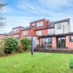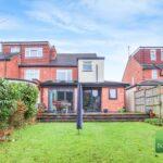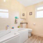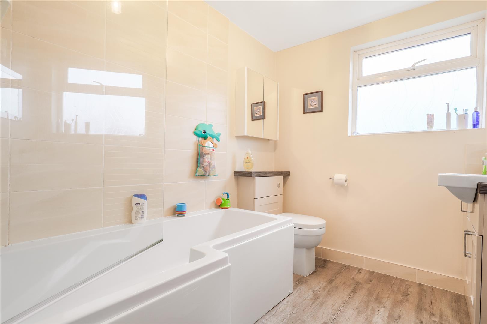 With a refitted three-piece white suite with low level encased three, vanity wash hand basin with cupboards below, panelled P shaped bath with mains fed shower with chrome fittings and attachments, heated chrome towel rail, Karndean, extractor fan, opaque double-glazed window to rear.