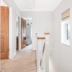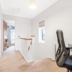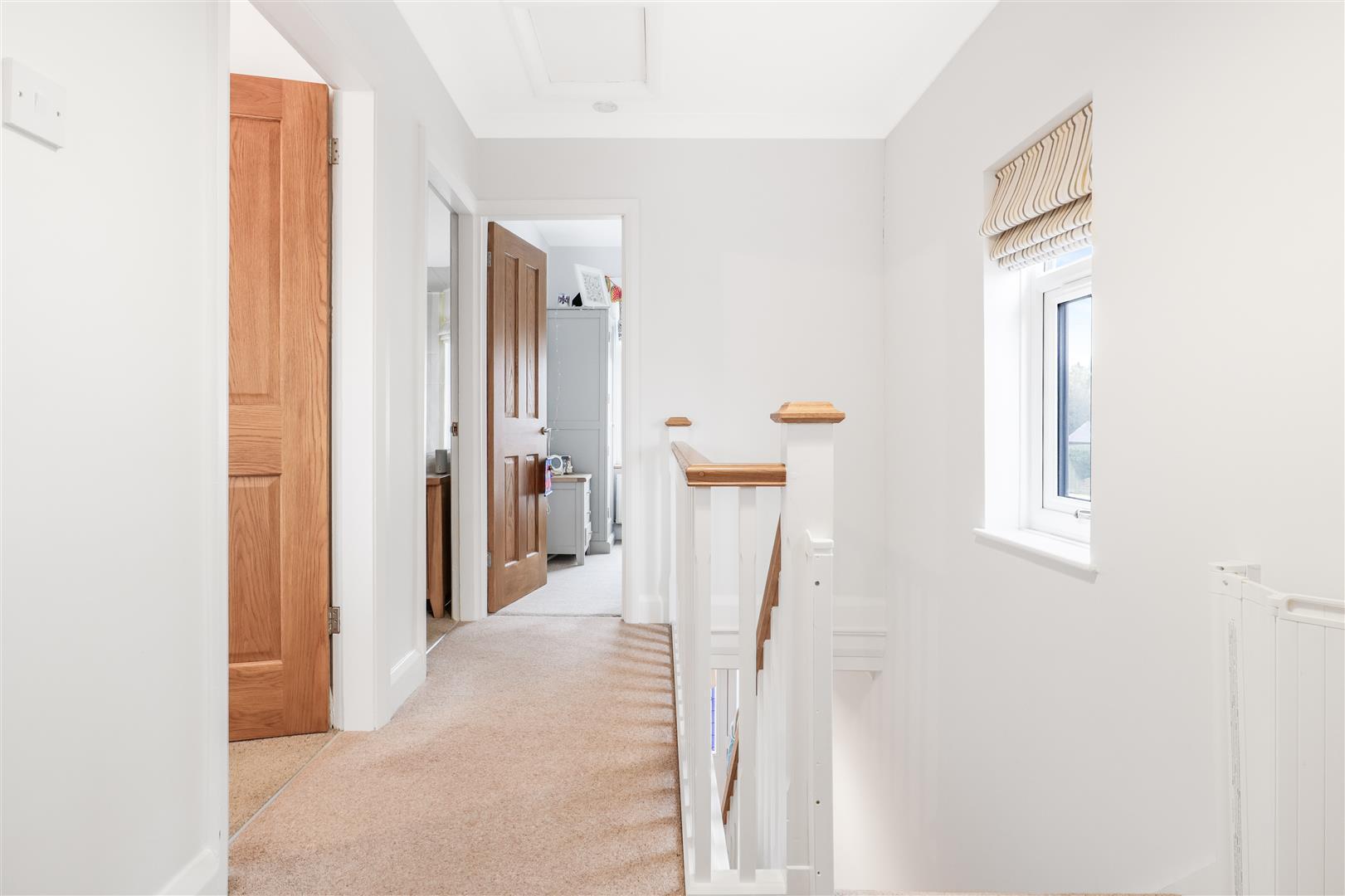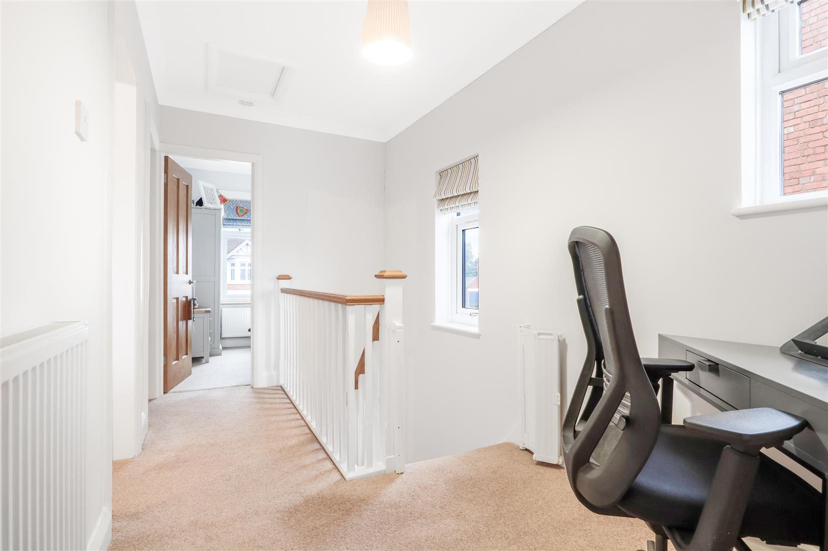 Spacious landing with matching banister rail and white wood spindles, space for desk, two double glazed windows to side, radiator, built-in airing cupboard with shelving.
