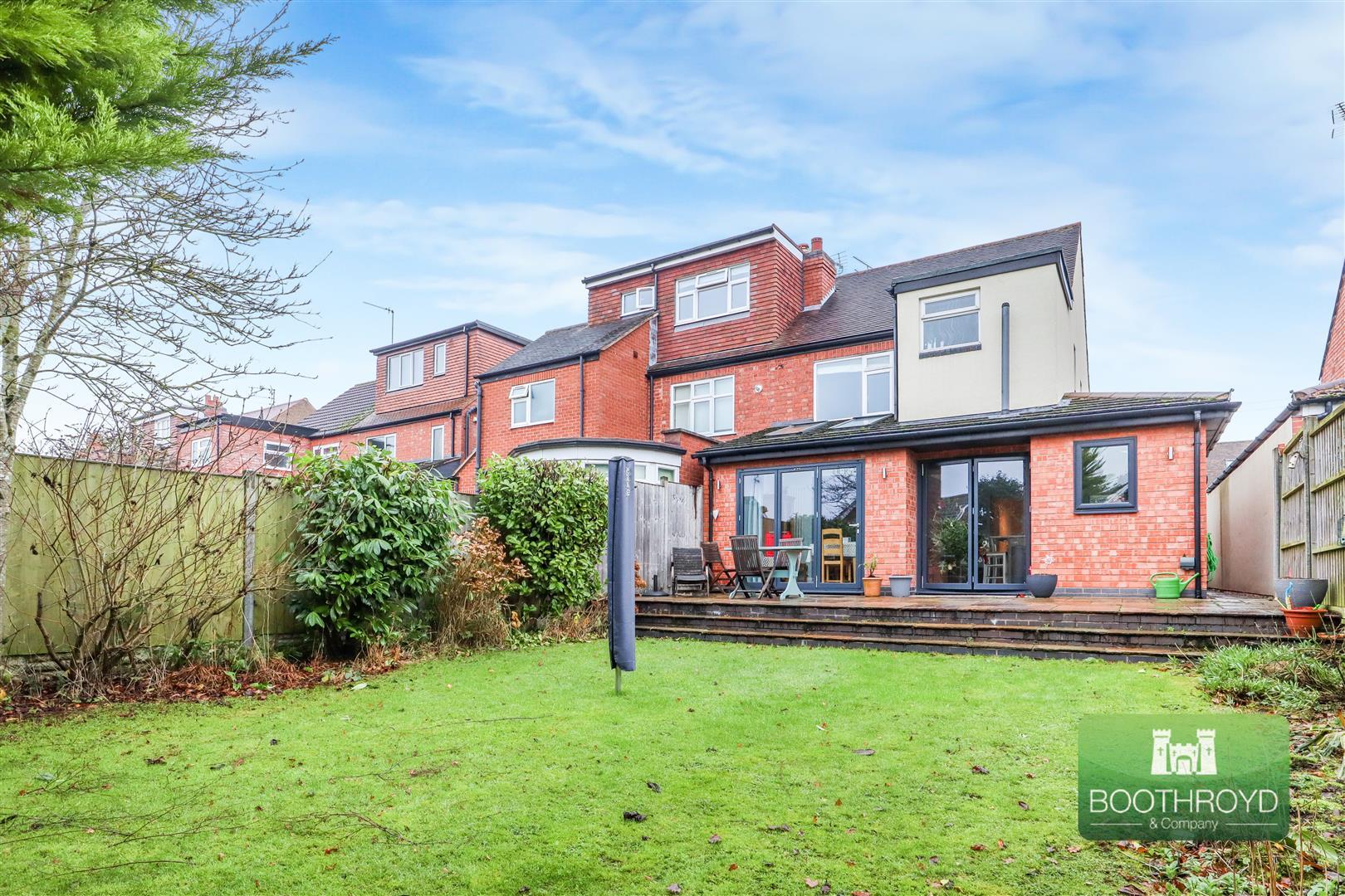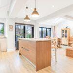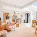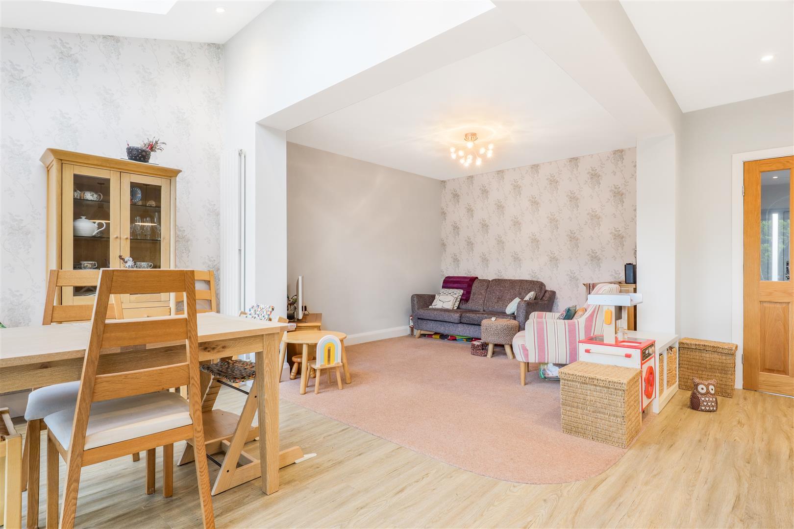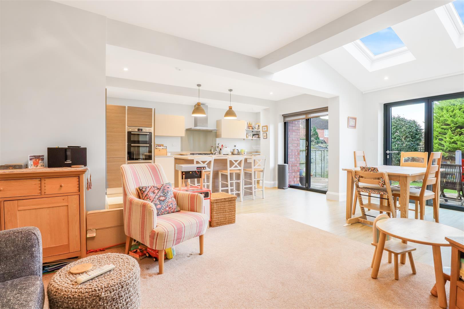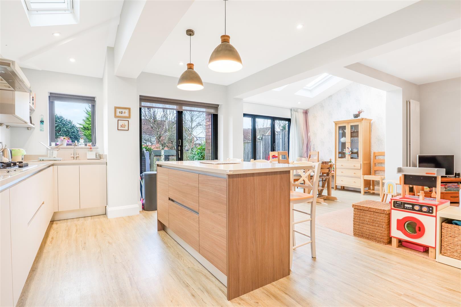 With space for breakfast or dining table, two Velux windows to ceiling, three leaf grey aluminium bi folding doors, Karndean flooring, LED ceiling down lighters.