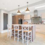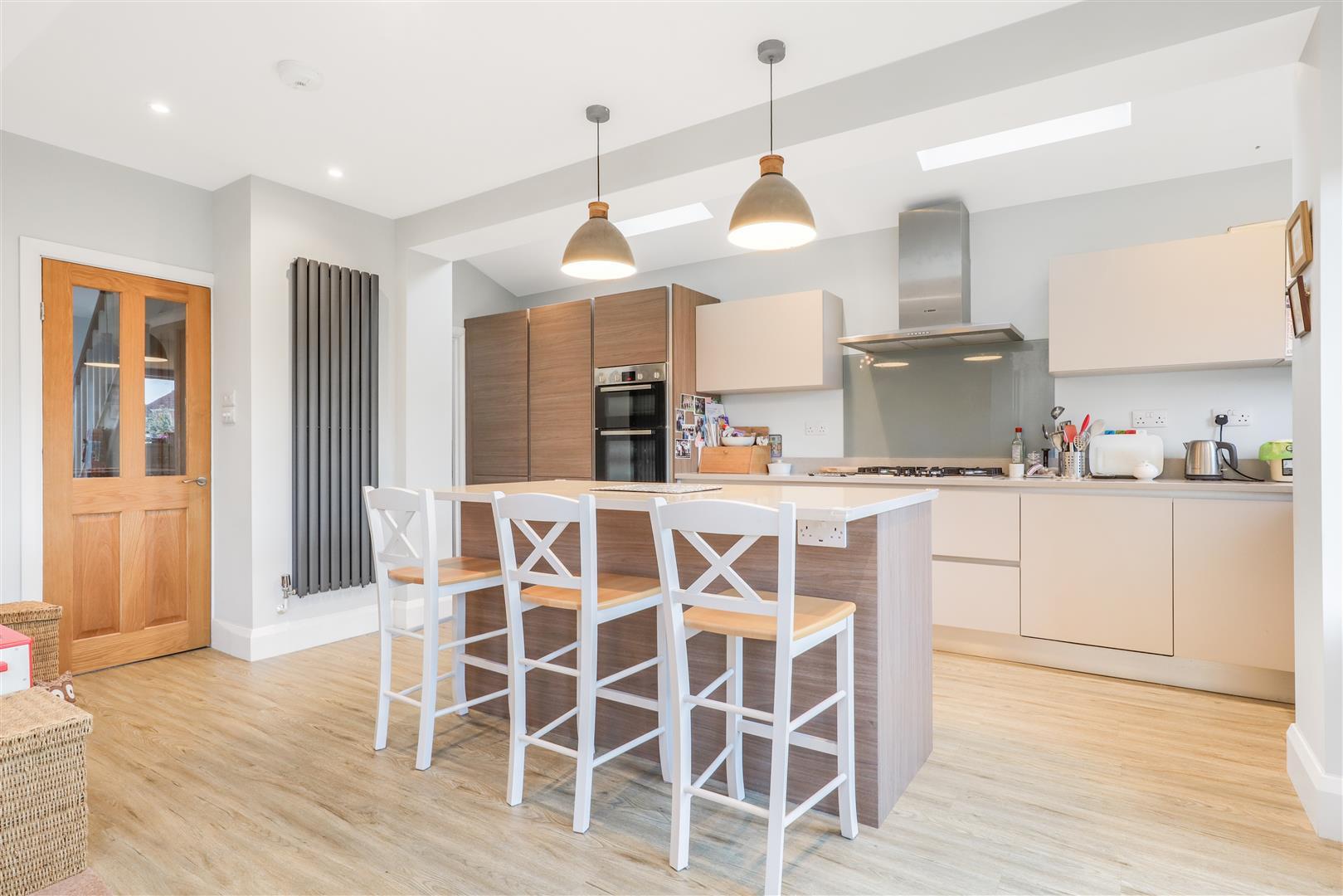 Kitchen area comprehensively refitted with a range of matching handless matt grey base and wall units with 30 mm quartz work surfaces with matching up- stands, one and half bowl granite composite sink with chrome mixer, integrated appliances to include a five ring Bosch stainless steel hob with illuminated stainless steel extractor hood, double fan assisted Bosch oven, integrated fridge freezer, dishwasher, island unit it with 30mm quartz work surfaces, three stool breakfast bar, two drop down feature lights, Karndean flooring, feature vertical radiator, two Velux, LED downlighters, double glazed window to front.