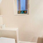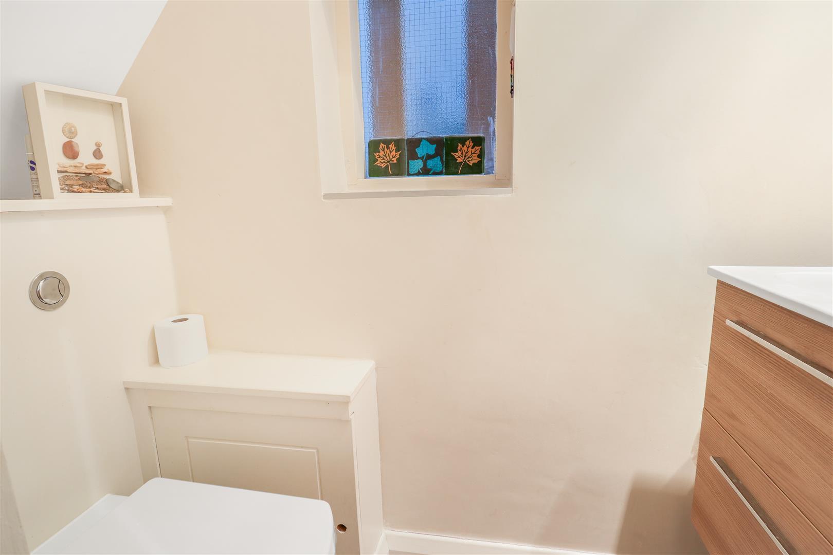 With a refitted two-piece white suite with low level w.c., wall hung vanity wash basin with draws below and central mixer tap, ceramic tiling splash back, ceiling light, internal window, Karndean floor.