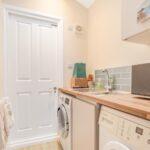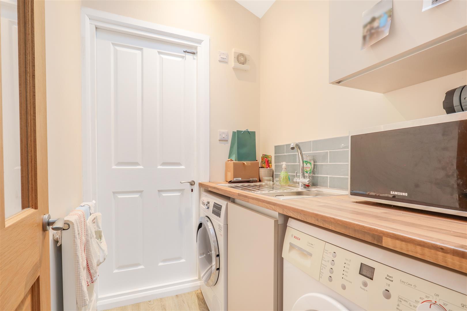 With matching matt grey base and wall units with wood grain effect rounded edge work surfaces with ceramic tiled splash backs, space and plumbing for washing machine and separate dryer, extractor fan, LED downlighters, Velux, Karndean floor, door to