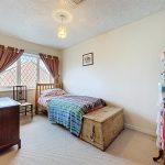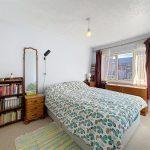 Window overlooking the rear, radiator, central ceiling light and wardrobe with hanging rail and shelving.