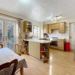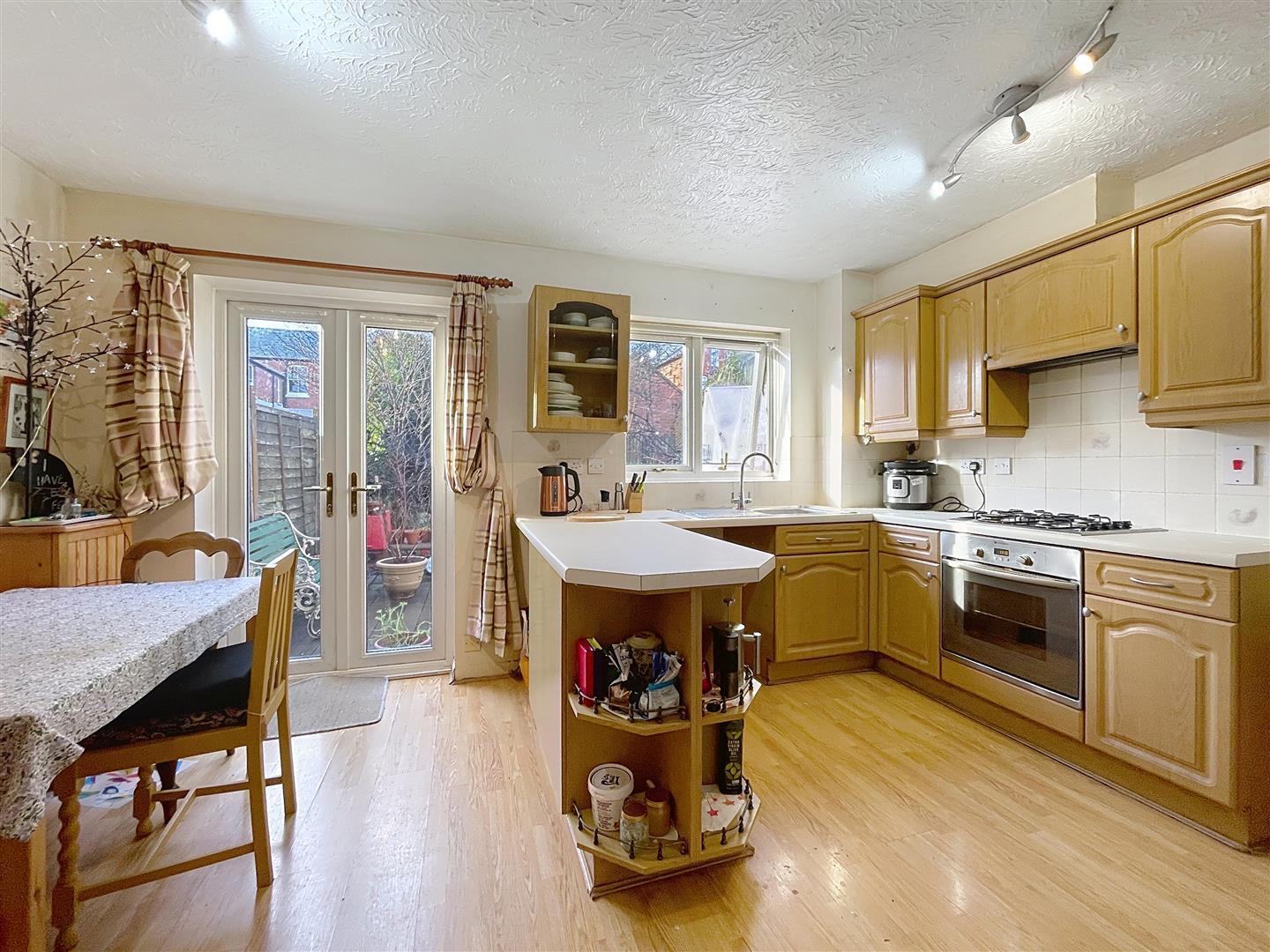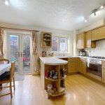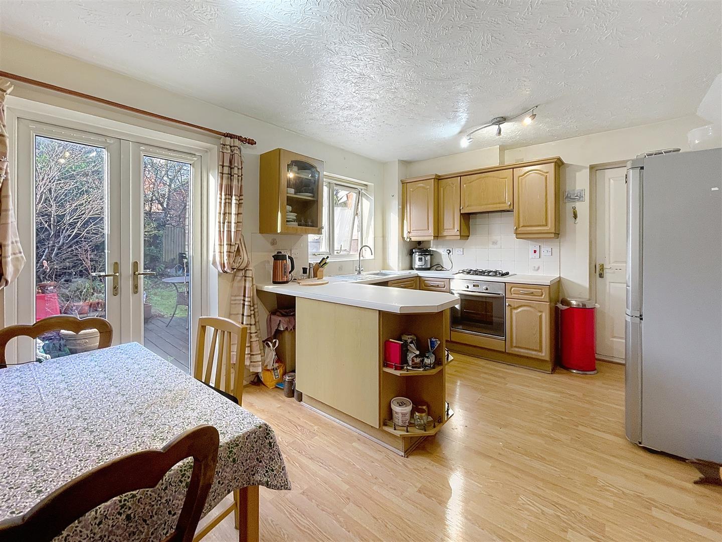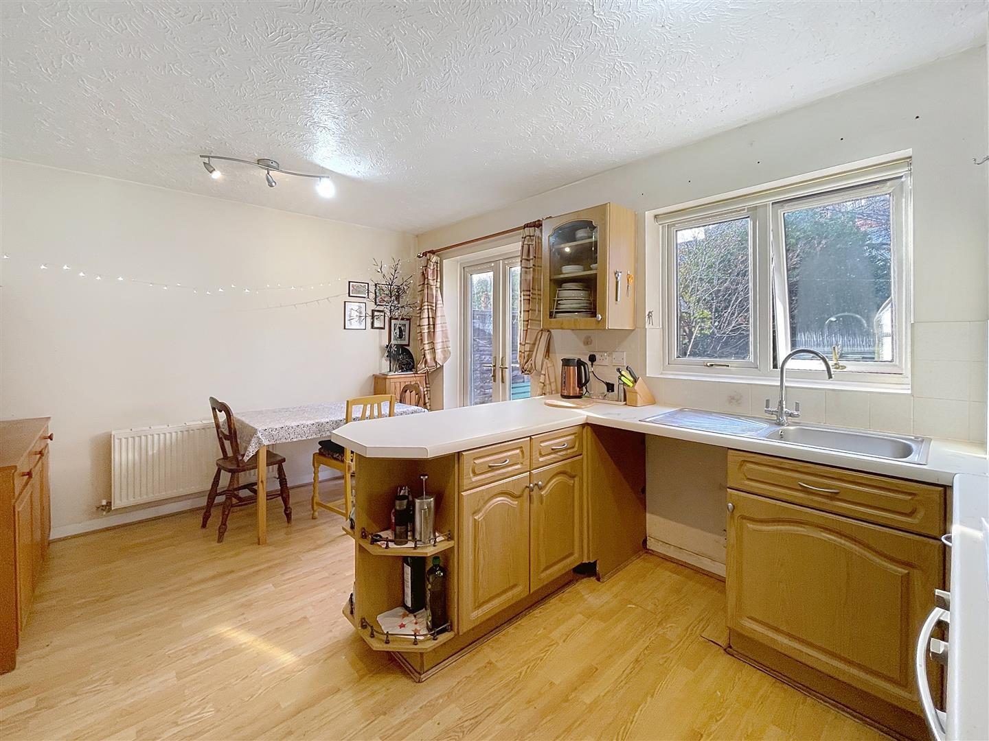 With light oak effect base and wall units with rollover worksurface with an inset single drainer sink unit set beneath a window to the garden. Complimentary tiling to splash backs. Space for upright fridge/freezer, built in Hotpoint electric oven set beneath a gas hob and illuminated extractor with space for dishwasher. Radiator, two track lights, useful storage cupboard, French door off to rear with further door off to garage allowing internal access.