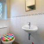 With half height ceramic tiling, opaque glazed window, low level WC, wash hand basin with chrome mixer tap, radiator and central ceiling light.