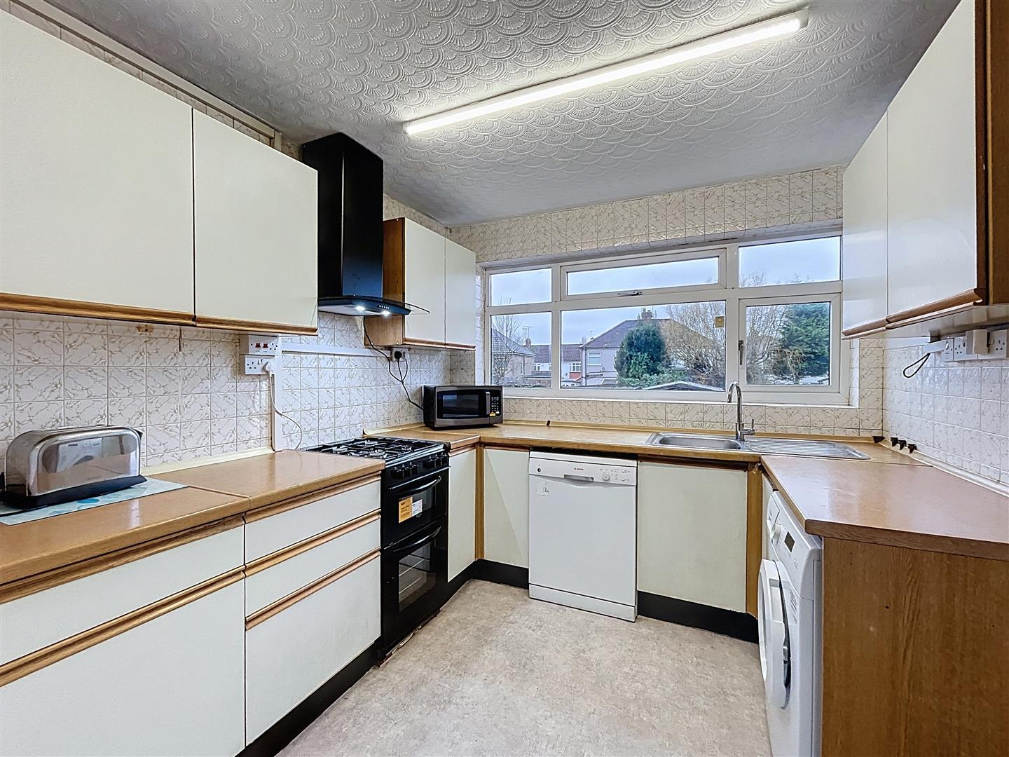 Vinyl flooring, with strip light, radiator and window to the fore. Base and wall units with rollover worktop with stainless steel sink with drainer, Bosch dishwasher, Bosch washing machine and new freestanding four ring gas stove with double oven and grill. Upvc door out to rear garden.