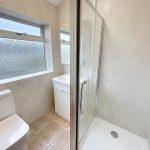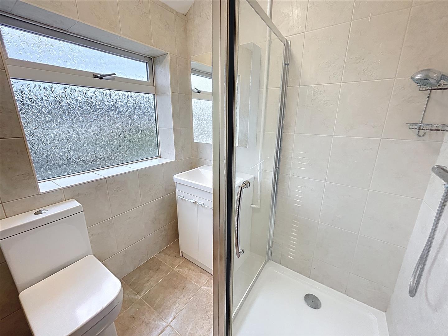 Full height ceramic tiled flooring and splash back, opaque glazed window to rear, cabinet wash hand basin with chrome mixer tap and mirror above, corner shower cubicle with glass panel screening with mains fed shower over and chrome heated towel rail.