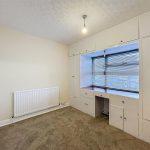 Window to the fore with radiator below, array of in-built wardrobes with hanging rial and shelving with further storage cupboard housing the combi boiler.