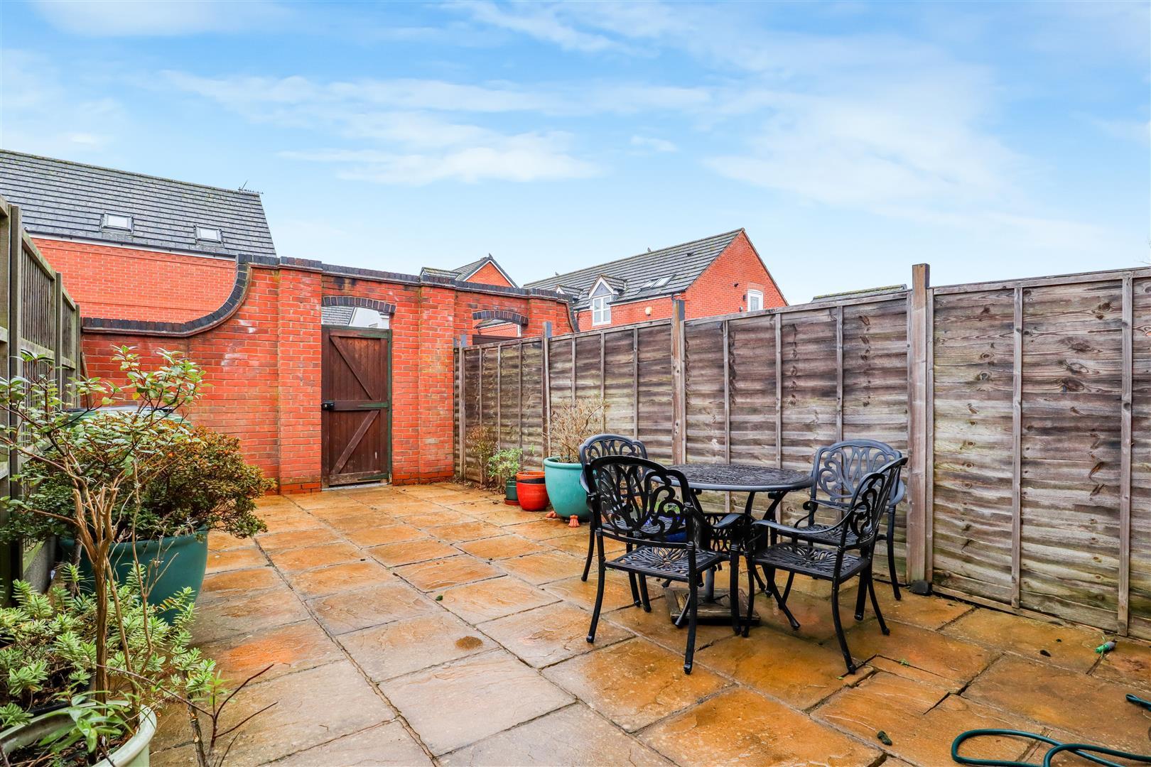 Paved with fencing to boundary. A gate leads you to the garages.