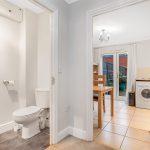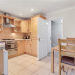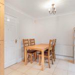 Comprehensively fitted with a range of modern wood-fronted wall and base units, complemented by stone-effect roll-top work surfaces incorporating an inset stainless-steel sink positioned beneath a double-glazed rear window. Coordinating tiled splashbacks enhance the finish. Integrated appliances include a built-in oven with four-ring gas hob and matching brushed-steel extractor canopy, flanked by twin display cabinets, along with a fridge freezer, dishwasher and washing machine. The space is finished with tiled flooring throughout. The adjoining dining area features uPVC French doors opening onto the rear garden, coving to the ceiling and a radiator
