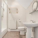 With a frosted Velux window, pedestal wash hand basin, close coupled wc and a double shower cubicle. Radiator, towel rail, shaver point and airing cupboard.