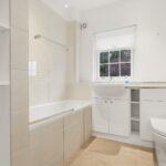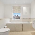 Four-piece white suite with chrome fittings, comprising a WC with a concealed push-button cistern, a bath with a mixer tap and shower attachment, and a vanity wash hand basin with white high-gloss soft-close drawers below. Wide mains fed shower enclosure with fixed drench shower head and glass shower door and side screen. Central heating towel rail, complementary tiled splashbacks, extractor fan, downlighters, tiled floor and a sealed unit double-glazed sash window to the front aspect.