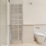 White suite comprising low level WC, vanity wash hand basin with complementary tiled splashbacks and storage below, extractor fan, downlighters and radiator.