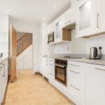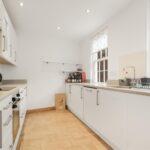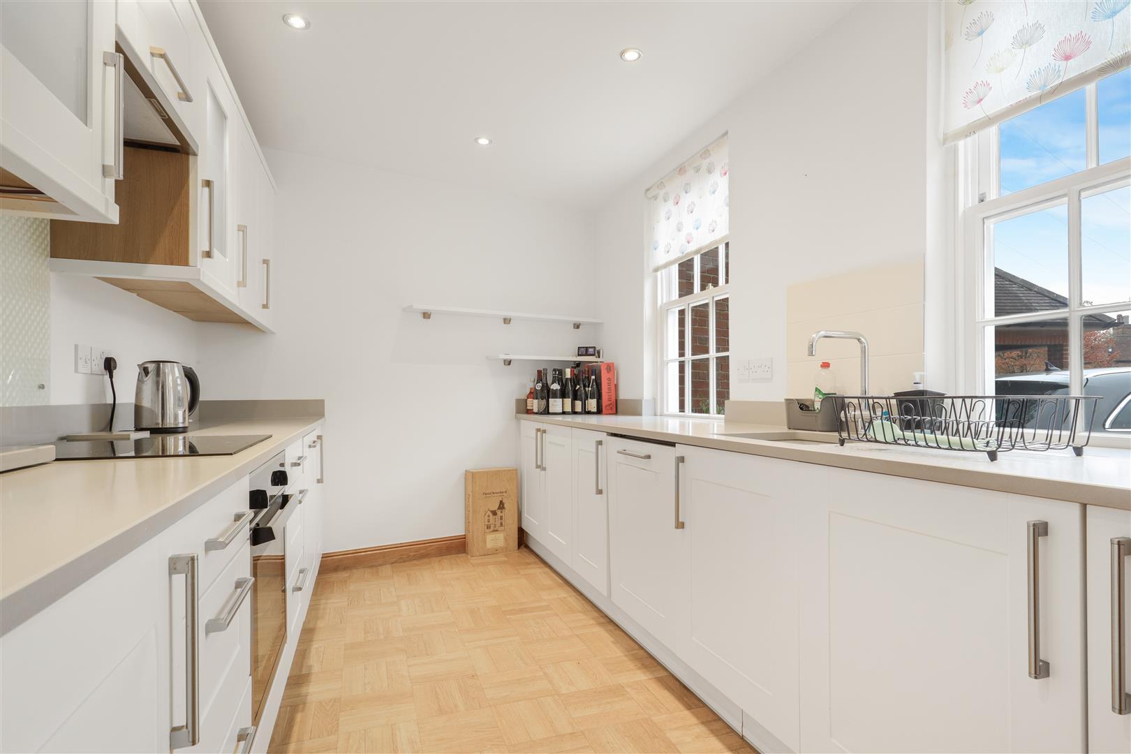 Attractive range of modern base and wall units, Grey sparkle Quartz worktops and matching upstands, an inset Franke sink with mixer tap. Built-in electric oven and touch control ceramic hob with illuminated extractor unit over, eye-level integrated appliances include microwave, fridge/freezer, dishwasher and washing machine. Tall storage unit, pullout bin, recessed downlighters, kickheater, Amtico floor and two sealed unit double-glazed sash windows to front aspect.