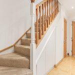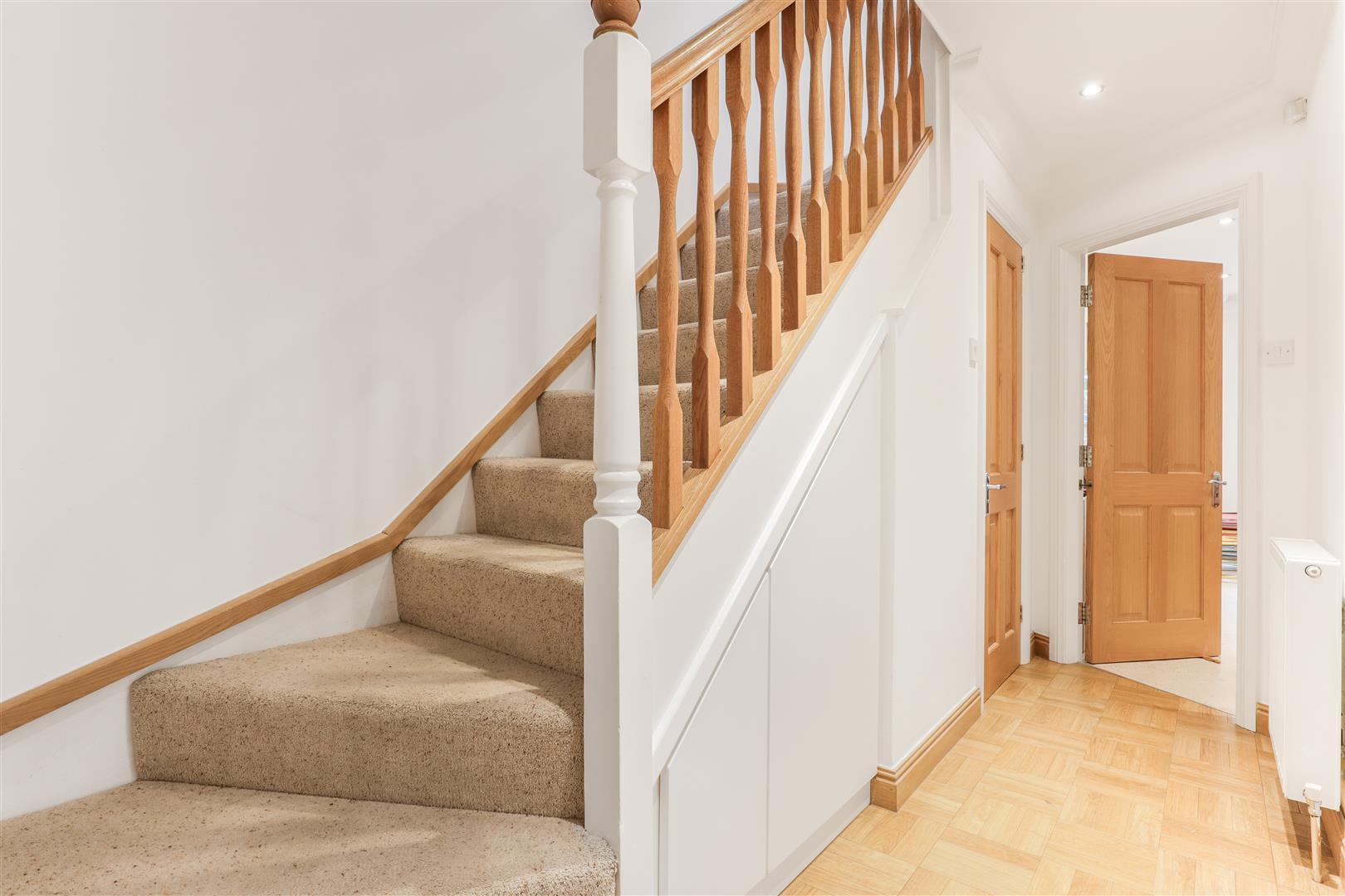 Wall-mounted digital thermostat control point, radiator, entryphone system, cornice to ceiling, mains powered smoke alarm, recessed downlighters, under stairs storage cupboards, Amtico wood effect floor, staircase rising to First Floor. Doors to: