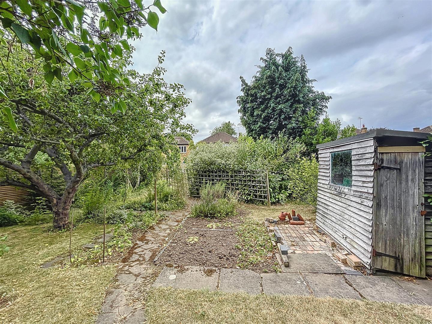 This property boasts a fantastic feature: a spacious lawn area complemented by a full-width patio. It is enclosed by perimeter fencing. The garden is adorned with a variety of shrubs and plants, and a pathway leads to the bottom, where you'll find fruit trees, a vegetable plot, a compost area, and a timber shed.