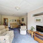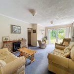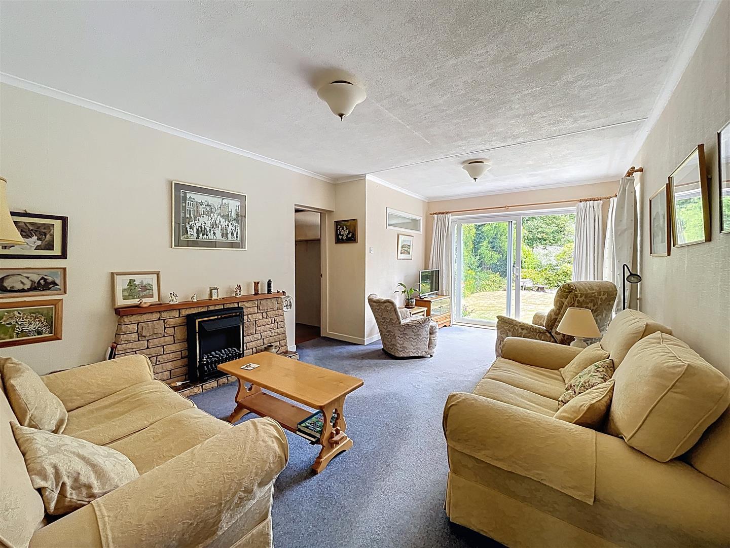 This space features two radiators, decorative coving, and two ceiling lights. The sliding patio doors offer a view of and access to the expansive rear garden, while a window is positioned at the side. The room is enhanced by a living flame effect electric fire with a brick inset and tiled hearth, complemented by a wooden mantle above. There’s also a door leading to the