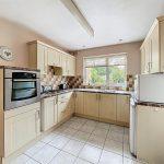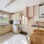 The kitchen features a set of coordinated beech-fronted base and wall units complemented by marble-effect rounded edge work surfaces. It includes a one-and-a-half bowl stainless steel sink with a chrome mixer tap and ceramic tiling on the splashback. The cooking area is equipped with an integrated four-ring Belling stainless steel gas hob, complete with a concealed illuminated extractor hood above. Additionally, there's a Belling eye-level fan-assisted electric oven with grill and space for an under-counter fridge freezer. The kitchen is well-lit with a ceiling strip light and downlighters, and there's room for a breakfast table. The ceramic floor tiles add a stylish touch, while a new wall-mounted Glow-worm boiler provides hot water and central heating. A radiator is also installed, along with a door leading to the side lobby.