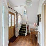 Featuring original oak strip flooring, a ceiling light, a radiator, and a handy under-stairs storage cupboard, the stairs lead up to the first floor, with a door providing access to