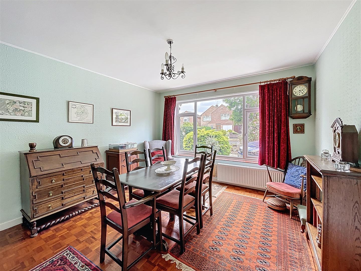 A front-facing double-glazed window, central ceiling light, two radiators, and parquet flooring.