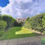 Garden with side gated access, a patio directly off the house, mature shaped borders, and a formal lawn.
