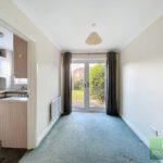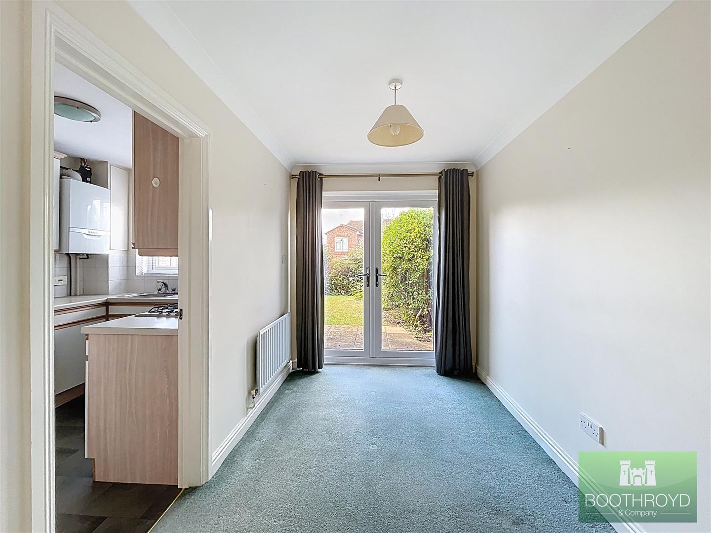 Dining area with French doors opening onto the rear garden, radiator, and door leading to the kitchen.