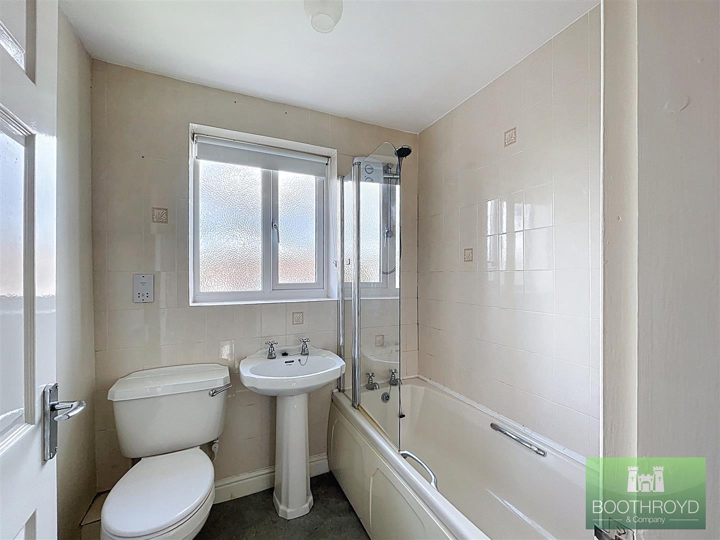 Bathroom fitted with a coloured suite comprising a panelled bath with electric shower over, pedestal wash hand basin, and close-coupled WC. Features include tiled splashbacks, heated towel rail, extractor fan, and a rear-facing window.