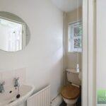 Bathroom comprising a close-coupled WC, wash hand basin, vinyl flooring, radiator, and a window to the front.