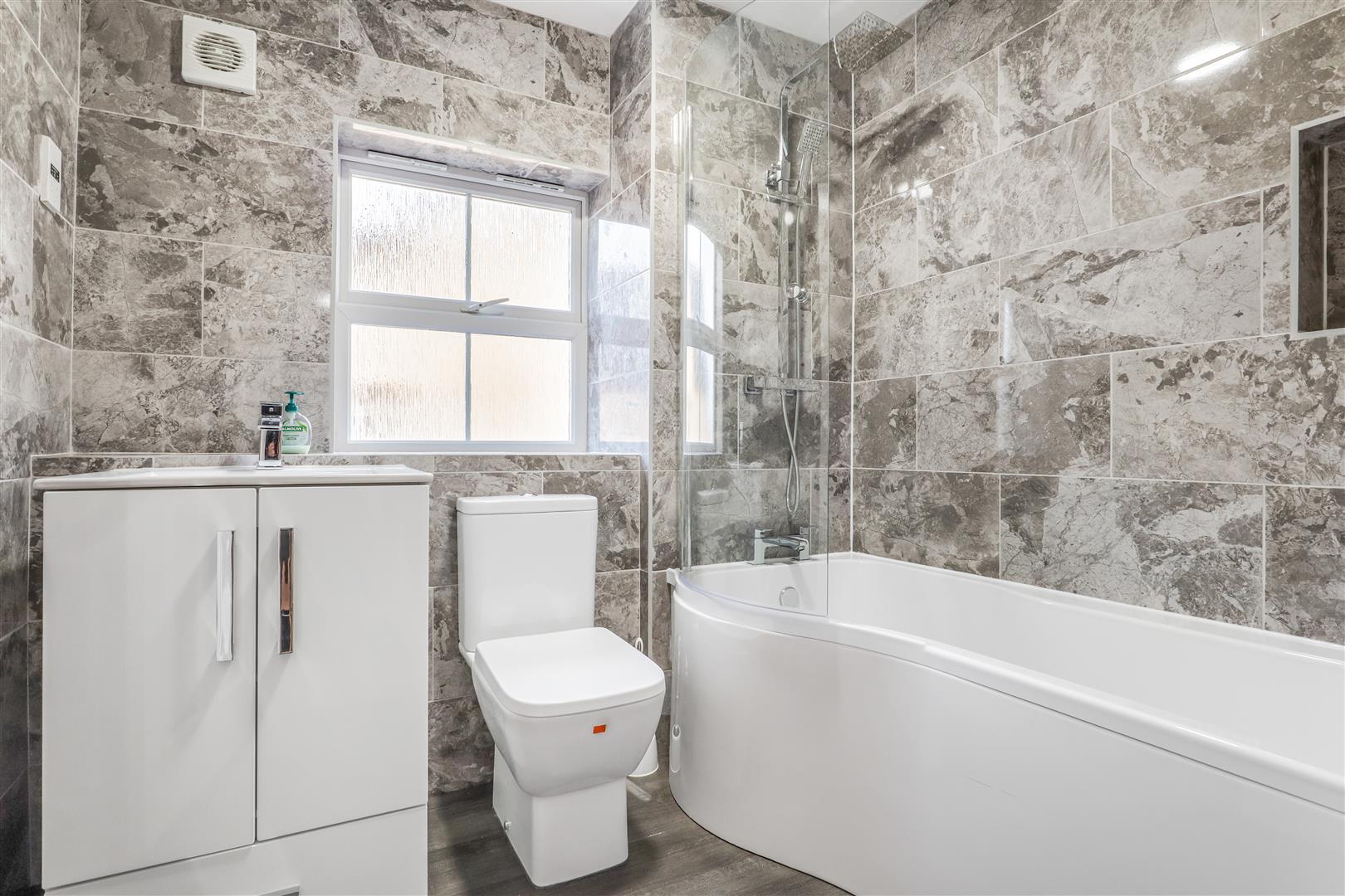 The bathroom features a newly refurbished three-piece white suite, including a low-level W.C. and a vanity wash hand basin with a cupboard underneath. It has a P-shaped panelled bath equipped with a fitted curved shower screen, mains-fed shower, chrome fittings, and twin shower attachments. The walls are adorned with porcelain tiles and include an alcove, while the floor is finished with laminate. Additionally, there is an opaque window on the side and a heated chrome towel rail.