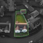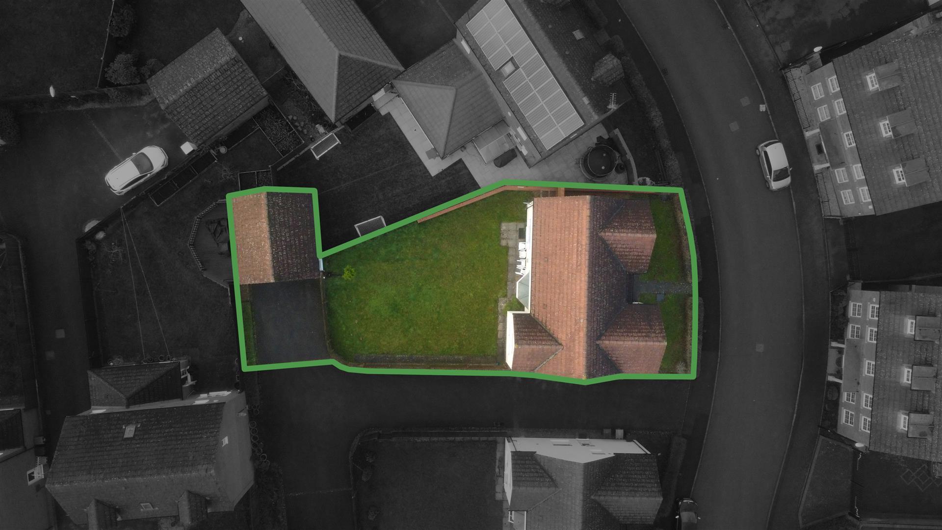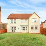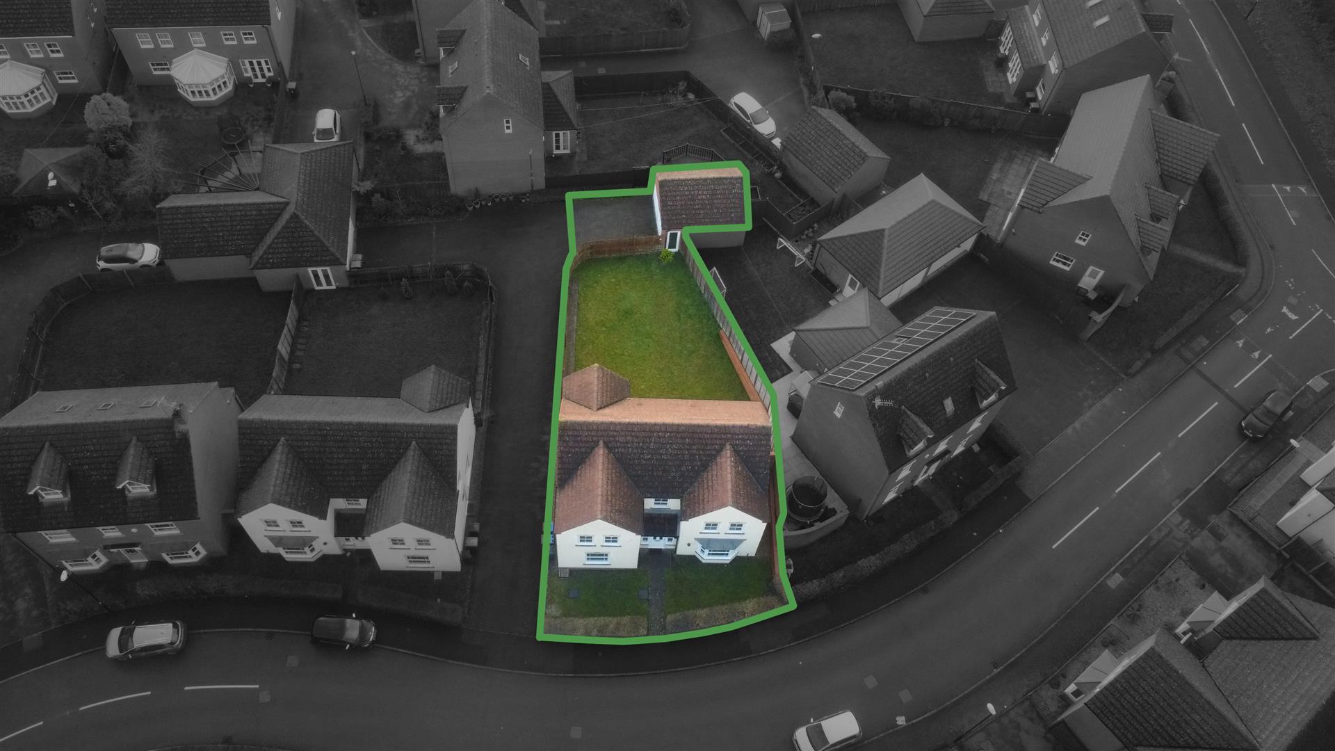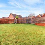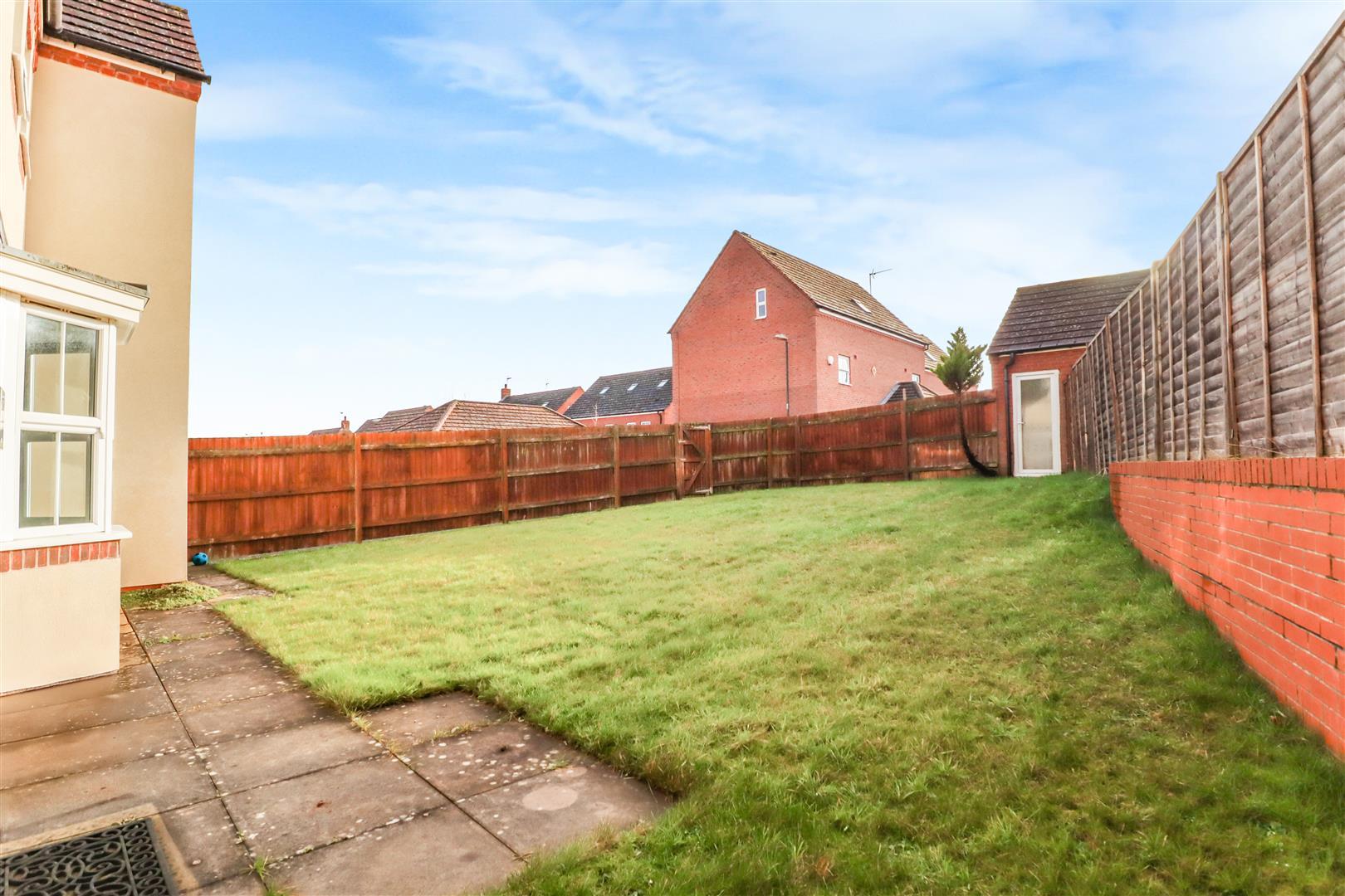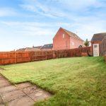 Small front garden featuring a lawn, low hedges, and a paved pathway leading to the front door. The rear garden is enclosed by timber fencing and is primarily covered with lawn, with a door leading to the double garage.