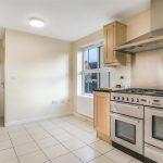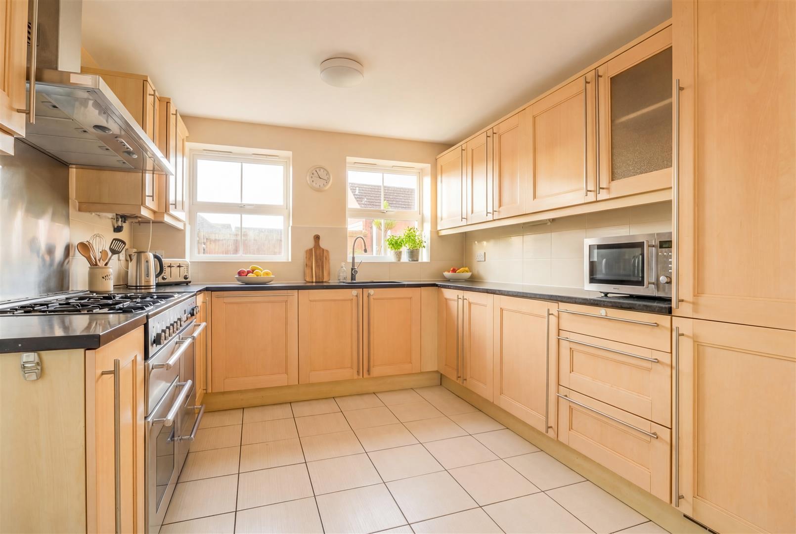 The kitchen is comprehensively equipped with matching beech-fronted base and wall units. It features a one-and-a-half sink with a single drainer unit, complemented by granite work surfaces and tiled splashbacks. Additionally, there is an integrated fridge/freezer, a dishwasher, and a Range Master double gas cooker with a stainless steel extractor hood above. The flooring is ceramic tiled, and there is a radiator, windows on the side and rear, space for a breakfast table, and a door leading to the outside.