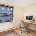 There are two rear windows, built-in wardrobes with hanging rails and shelving, a radiator, and wood laminate flooring. Door leads to: