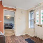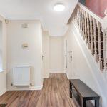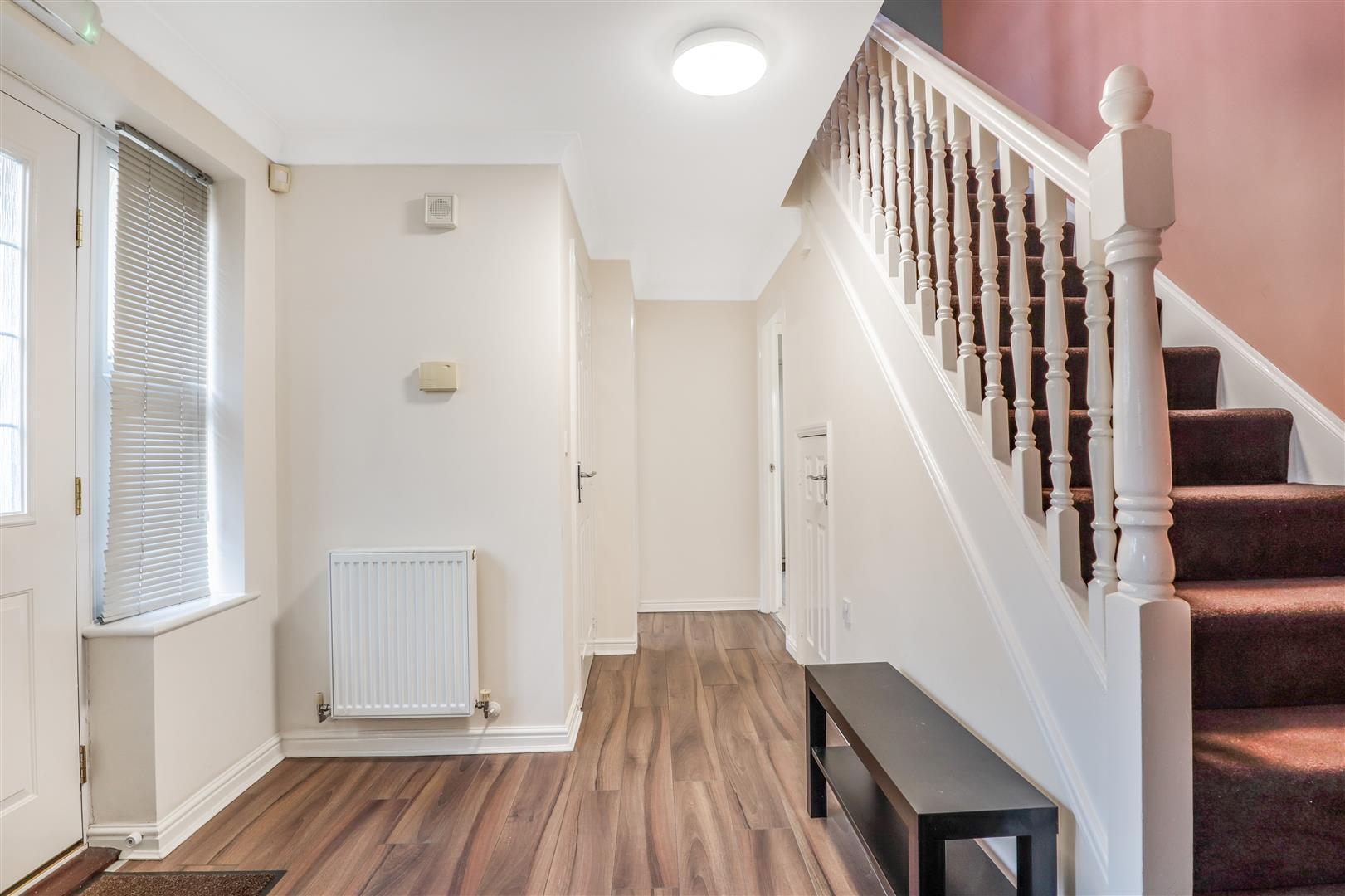 With stairs leading to the first floor, an under-stair storage cupboard, radiator, and laminate flooring, with doors leading to: