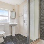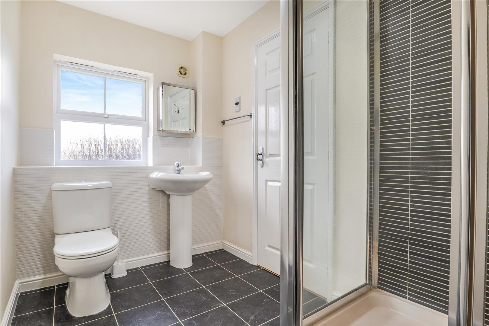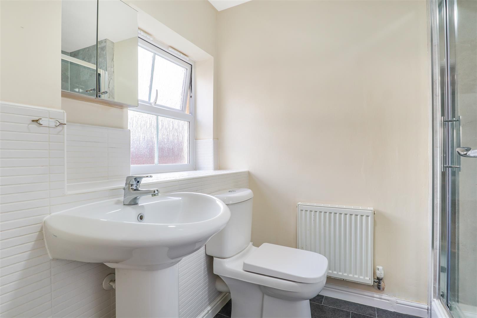 With a refitted three-piece white suite, low-level WC, pedestal wash hand basin, and a large walk-in shower enclosure with mains-fed water, an opaque window to the rear, and a radiator.