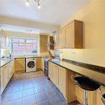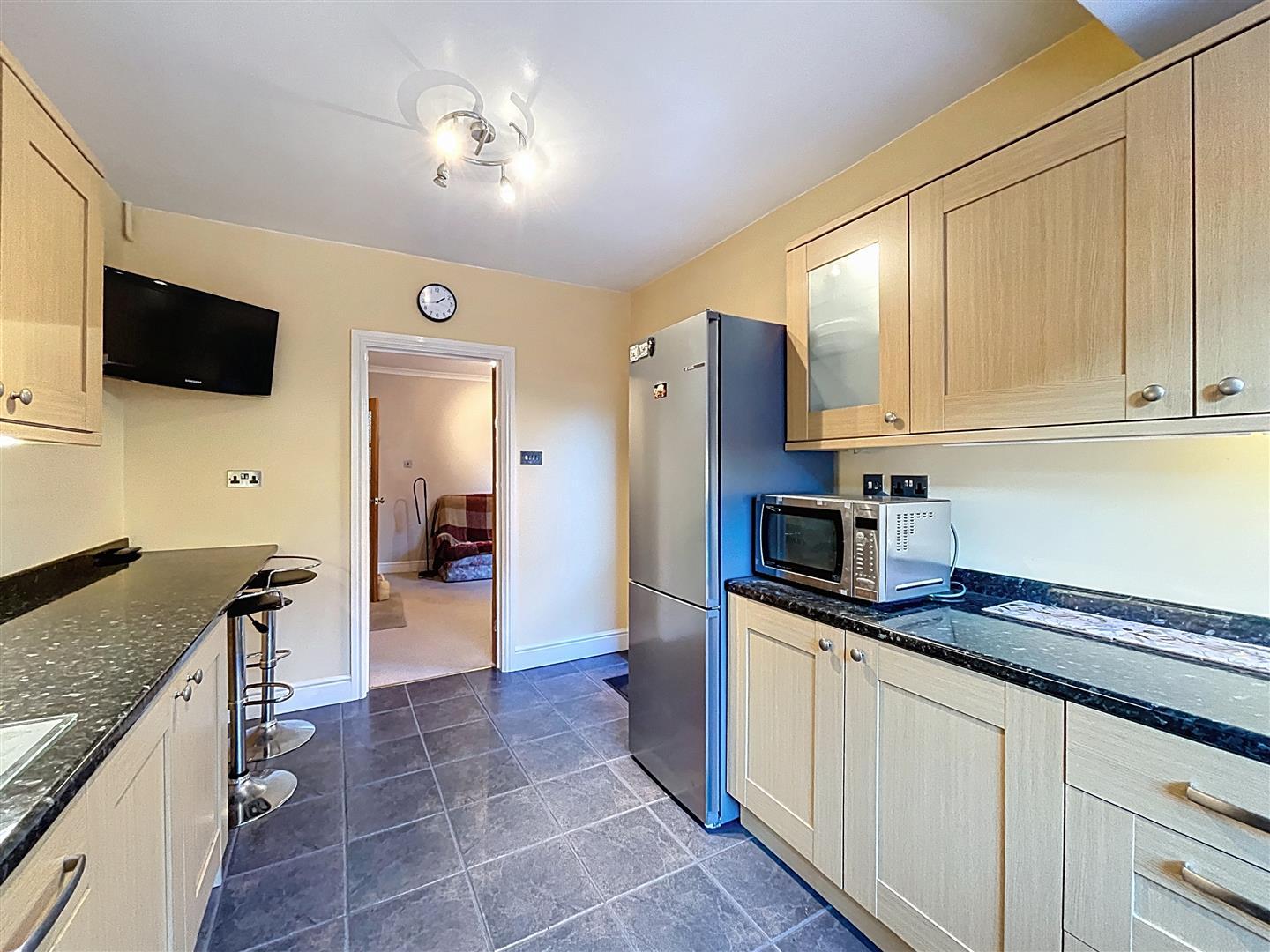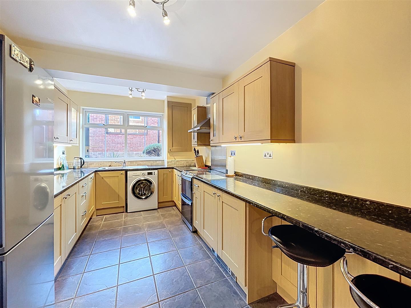 An integrated Zanussi dishwasher is provided, along with plumbing for a washing machine and space for a large fridge freezer. Splashbacks are ceramic-tiled, with additional lighting from under-pelmet and cupboard lights, plus two ceiling lights. The ceramic tiled floor and a window overlook the rear, while the side door provides access. A cupboard houses the Baxi Platinum 28HE combination boiler.
