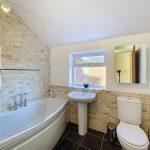 Three-piece white suite featuring a low-level W.C., pedestal wash hand basin, and a mains-fed shower over a curved bath with a fitted screen. There is a window to the side, a radiator, wall tiling, a heated towel rail, and a mirrored vanity cabinet.